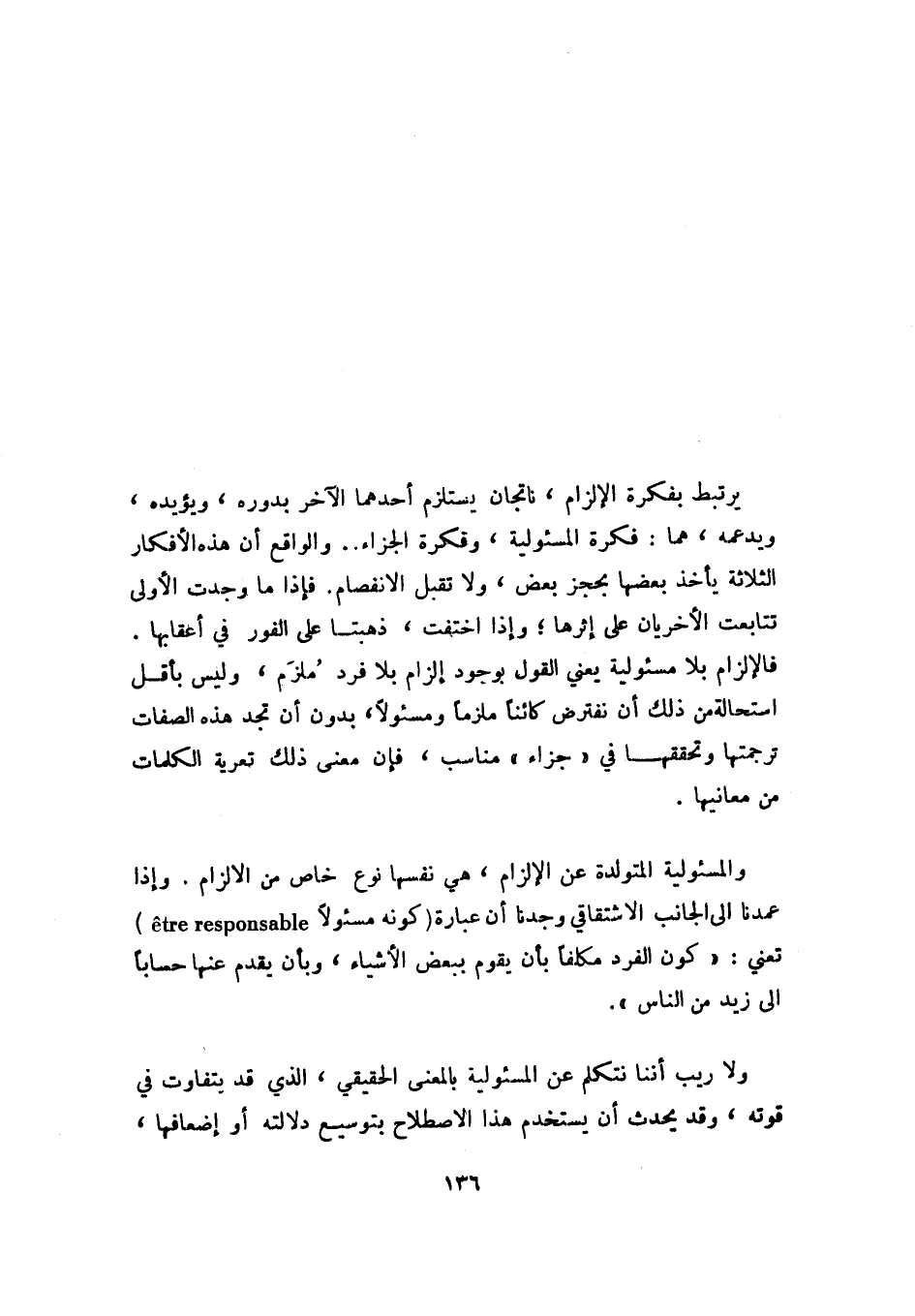 والمسئولية المتولدة عن الإلزام، هي نفسها نوع خاص من الإلزام. وإذا عمدنا إلى الجانب الاشتقاقي وجدنا أن عبارة "كونه مسئولًا etre responsable" تعني: "كون الفرد مكلفًا بأن يقوم ببعض الأشياء، وبأن يقدم عنها حسابًا إلى زيد من الناس".