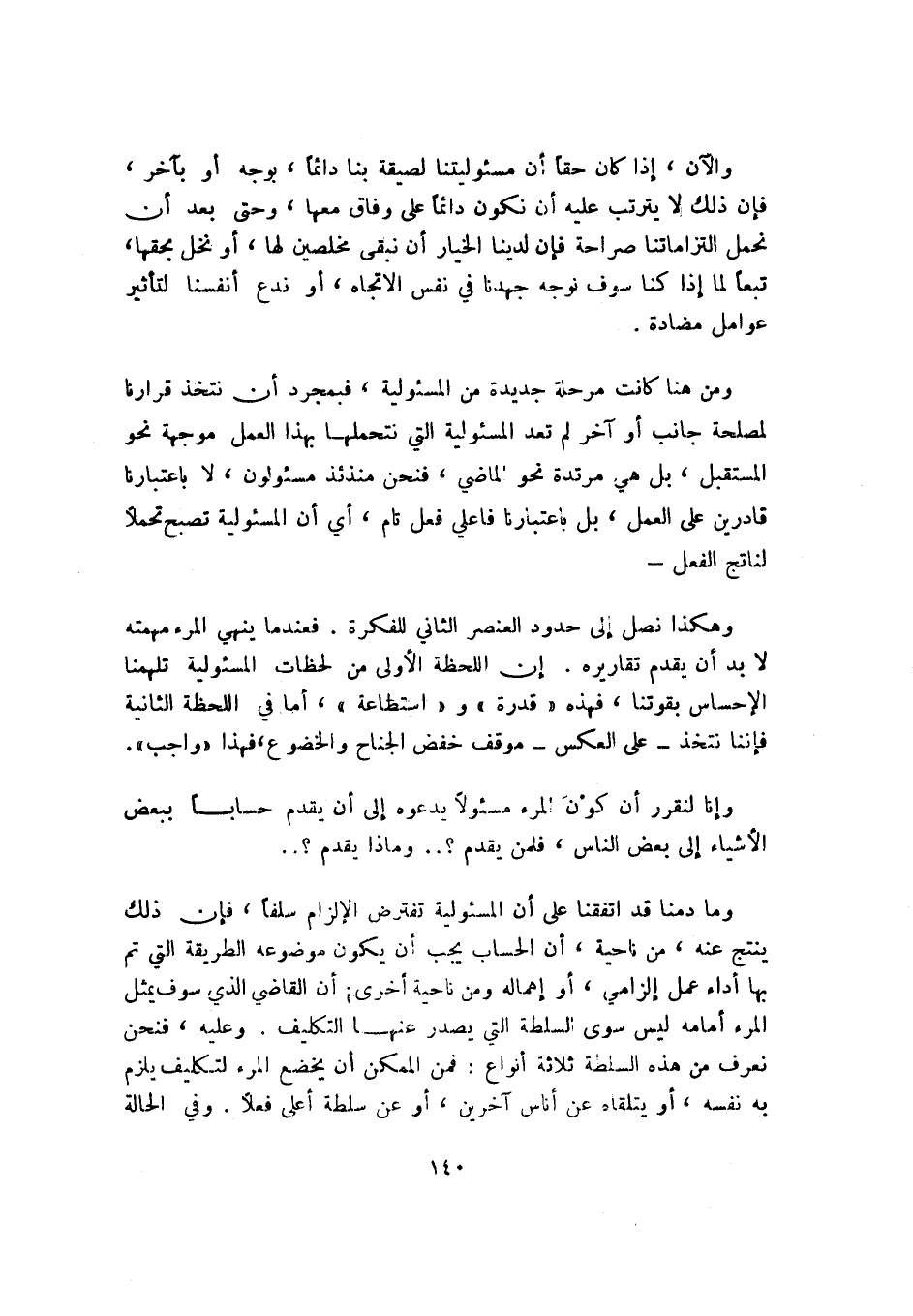 وإنا لنقرر أن كون المرء مسئولًا يدعوه إلى أن يقدم حسابًا ببعض الأشياء إلى بعض الناس، فلمن يقدم؟ ... وماذا يقدم؟