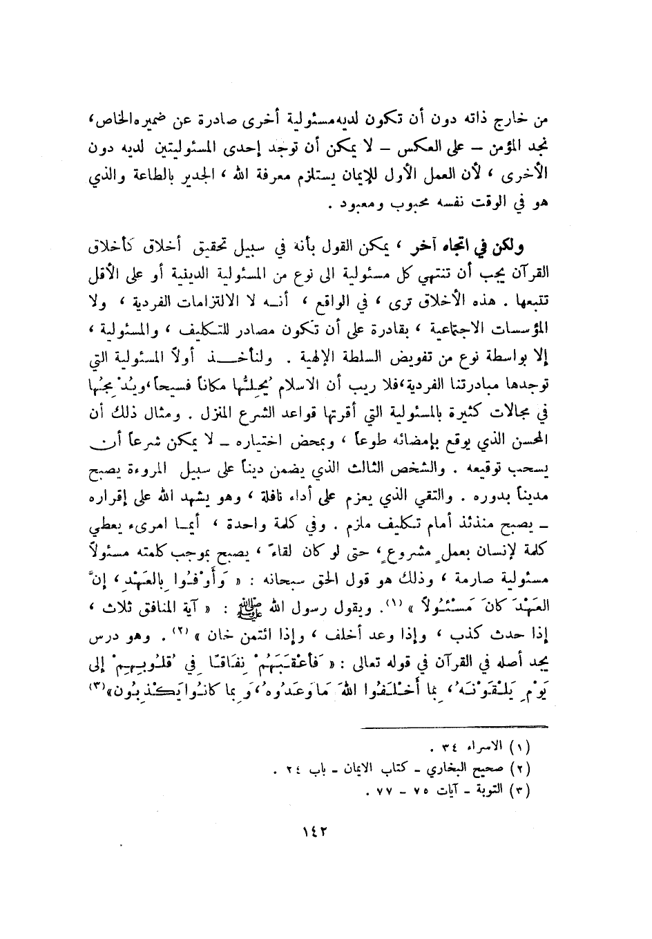 ولكن في اتجاه آخر, يمكن القول بأنه في سبيل تحقيق أخلاق كأخلاق القرآن يجب أن تنتهي كل مسئولية إلى نوع من المسئولية الدينية أو على الأقل تتبعها. هذه الأخلاق ترى في الواقع، أنه لا الالتزامات الفردية، ولا المؤسسات الاجتماعية، بقادرة على أن تكون مصادر للتكليف، والمسئولية، إلا بواسطة نوع من تفويض السلطة الإلهية. ولنأخذ أولًا المسئولية التي توجدها مبادرتنا الفردية، فلا ريب أن الإسلام يحلها مكانًا فسيحًا، ويدمجها في مجالات كثيرة بالمسئولية التي أقرتها قواعد الشرع المنزل. ومثال ذلك أن المحسن الذي يوقع بإمضائه طوعًا، وبمحض اختياره -لا يمكن شرعًا أن يسحب توقيعه, والشخص الثالث الذي يضمن دينًا على سبيل المروءة يصبح مدينًا بدوره, والتقي الذي يعزم على أداء نافلة, وهو يشهد الله على إقراره-يصبح منذئذ أمام تكليف ملزم, وفي كلمة واحدة، أيما امرئ يعطي كلمة لإنسان بعمل مشروع، حتى لو كان لقاء، يصبح بموجب كلمته مسئولًا مسئولية صارمة، وذلك هو قول الحق سبحانه: {وَأَوْفُوا بِالْعَهْدِ إِنَّ الْعَهْدَ كَانَ مَسْؤُولًا} 1. ويقول رسول الله, صلى الله عليه وسلم: "آية المنافق ثلاث: إذا حدّث كذب، وإذا وعد أخلف، وإذا ائتمن خان" 2. وهو درس يجد أصله في القرآن في قوله تعالى: {فَأَعْقَبَهُمْ نِفَاقًا فِي قُلُوبِهِمْ إِلَى يَوْمِ يَلْقَوْنَهُ بِمَا أَخْلَفُوا اللَّهَ مَا وَعَدُوهُ وَبِمَا كَانُوا يَكَذِبُونَ} 3.
