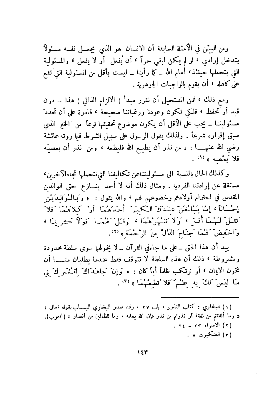 ومن البيّن في الأمثلة السابقة أن الإنسان هو الذي يجعل نفسه مسئولًا بتدخل إرادي، لو لم يكن لبقي حرًّا، أن يفعل أو لا يفعل، والمسئولية التي يتحملها حينئذ، أمام الله -كما رأينا- ليست بأقل من المسئولية التي تقع على كاهله، أن يقوم بالواجبات الجوهرية.