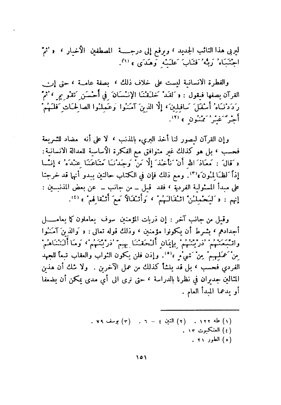 وقيل من جانب آخر: إن ذريات المؤمنين سوف يعاملون كما يعامل أجدادهم، بشرط أن يكونوا مؤمنين، وذلك قوله تعالى: {وَالَّذِينَ آمَنُوا وَاتَّبَعَتْهُمْ ذُرِّيَّتُهُمْ بِإِيمَانٍ أَلْحَقْنَا بِهِمْ ذُرِّيَّتَهُمْ وَمَا أَلَتْنَاهُمْ مِنْ عَمَلِهِمْ مِنْ شَيْء} 5. وإذن فلن يكون الثواب والعقاب تبعًا للجهد الفردي فحسب، بل قد ينشأ كذلك من عمل الآخرين. ولا شك أن هذين المثالين جديران في نظرنا بالدراسة، حتى نرى إلى أي مدى يمكن أن يضعفا أو يدعما المبدأ العام.