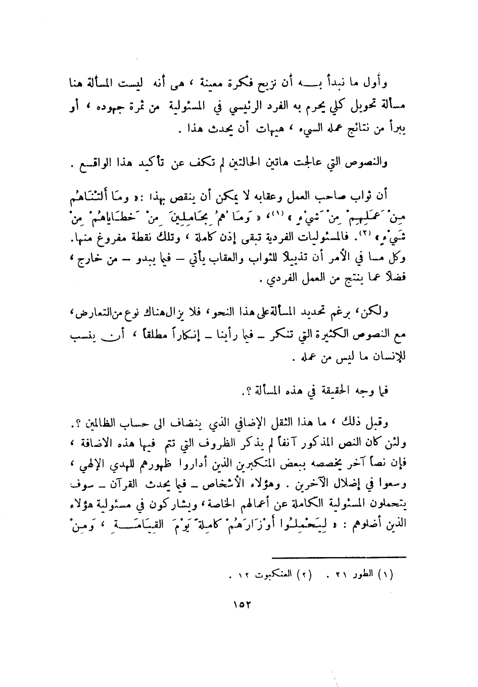 ولكن برغم تحديد المسألة على هذا النحو، فلا يزال هناك نوع من التعارض، مع النصوص الكثيرة التي تنكر -فيما رأينا- إنكارًا مطلقًا، أن ينسب للإنسان ما ليس من عمله.