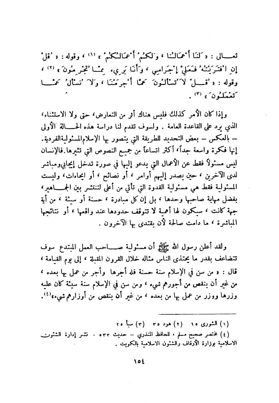 وإذا كان الأمر كذلك فليس هناك أثر من التعارض، حتى ولا الاستثناء، الذي يرد على القاعدة العامة. ولسوف تقدم لنا دراسة هذه الحالة الأولى -بالعكس- بعض التحديد للطريقة التي يتصور بها الإسلام المسئولية الفردية. إنها فكرة واسعة جدًّا، أكثر اتساعًا من جميع النصوص التي تثيرها, فالإنسان ليس مسئولًا فقط عن الأعمال التي يدعو إليها في صورة تدخل إيجابي ومباشر لدى الآخرين، حين يصدر إليهم أوامر، أو نصائح، أو إيحاءات، وليست المسئولية فقط هي مسئولية القدوة التي تأتي من أعلى لتنتشر بين الجماهير، بفضل مهابة صاحبها وحدها، بل إن كل مبادرة، حسنة أو سيئة، من أية جهة كانت، سيكون لها أهمية لا تتوقف حدودها عند واقعها، أو نتائجها المباشرة، ما دامت صالحة لأن يقتدي بها الآخرون.