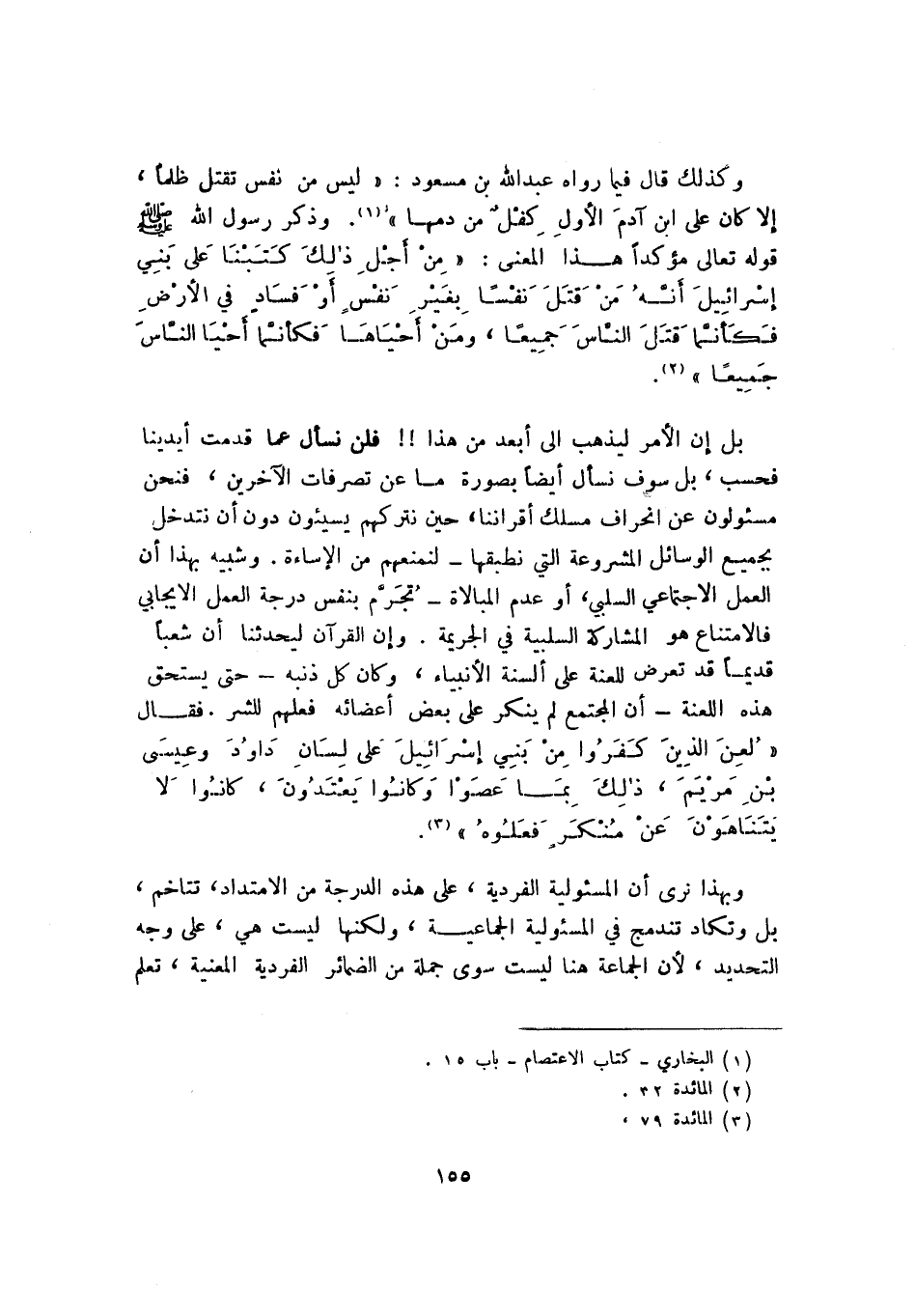 وكذلك قال فيما رواه عبد الله بن مسعود: "ليس من نفس تقتل ظلمًا، إلا كان على ابن آدم الأول كفل من دمها" 1. وذكر رسول الله -صلى الله عليه وسلم- قوله تعالى مؤكدًا هذا المعنى: {مِنْ أَجْلِ ذَلِكَ كَتَبْنَا عَلَى بَنِي إِسْرائيلَ أَنَّهُ مَنْ قَتَلَ نَفْسًا بِغَيْرِ نَفْسٍ أَوْ فَسَادٍ فِي الْأَرْضِ فَكَأَنَّمَا قَتَلَ النَّاسَ جَمِيعًا وَمَنْ أَحْيَاهَا فَكَأَنَّمَا أَحْيَا النَّاسَ جَمِيعًا} 2.