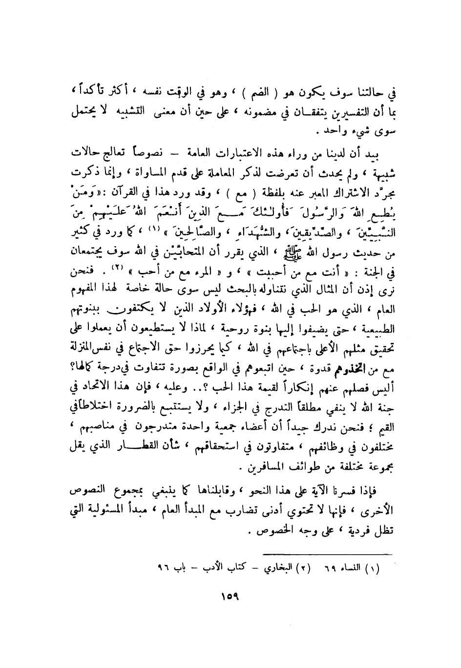 بيد أن لدينا من وراء هذه الاعتبارات العامة -نصوصًا تعالج حالات شبيهة، ولم يحدث أن تعرضت لذكر المعاملة على قدم المساواة، وإنما ذكرت مجرد الاشتراك المعبر عنه بلفظة "مع"، وقد ورد هذا في القرآن: {وَمَنْ يُطِعِ اللَّهَ وَالرَّسُولَ فَأُولَئِكَ مَعَ الَّذِينَ أَنْعَمَ اللَّهُ عَلَيْهِمْ مِنَ النَّبِيِّينَ وَالصِّدِّيقِينَ وَالشُّهَدَاءِ وَالصَّالِحِينَ} 1، كما ورد في كثير من حديث رسول الله -صلى الله عليه وسلم- الذي يقرر أن المتحابين في الله سوف يجتمعان في الجنة: "أنت مع من أحببت" و "المرء مع من أحب" 2. فنحن نرى إذن أن المثال الذي نتناوله بالبحث ليس سوى حالة خاصة لهذا المفهوم العام، الذي هو الحب في الله، فهؤلاء الأولاد الذين لا يكتفون ببنوتهم الطبيعية، حتى يضيفوا إليها بنوة روحية، لماذا لا يستطيعون أن يعملوا على تحقيق مثلهم الأعلى باجتماعهم في الله، كيما يحرزوا حق الاجتماع في نفس المنزلة مع من اتخذوهم قدوة، حين اتبعوهم في الواقع بصورة تتفاوت في درجة كمالها؟ أليس فصلهم عنهم إنكارًا لقيمة هذا الحب؟ وعليه، فإن هذا الاتحاد في جنة الله لا ينفي مطلقًا التدرج في الجزاء. ولا يستتبع بالضرورة اختلاطًا في القيم؛ فنحن ندرك جيدًا أن أعضاء جمعية واحدة متدرجون في مناصبهم، مختلفون في وظائفهم، متفاوتون في استحقاقهم، شأن القطار الذي يقل مجموعة مختلفة من طوائف المسافرين.