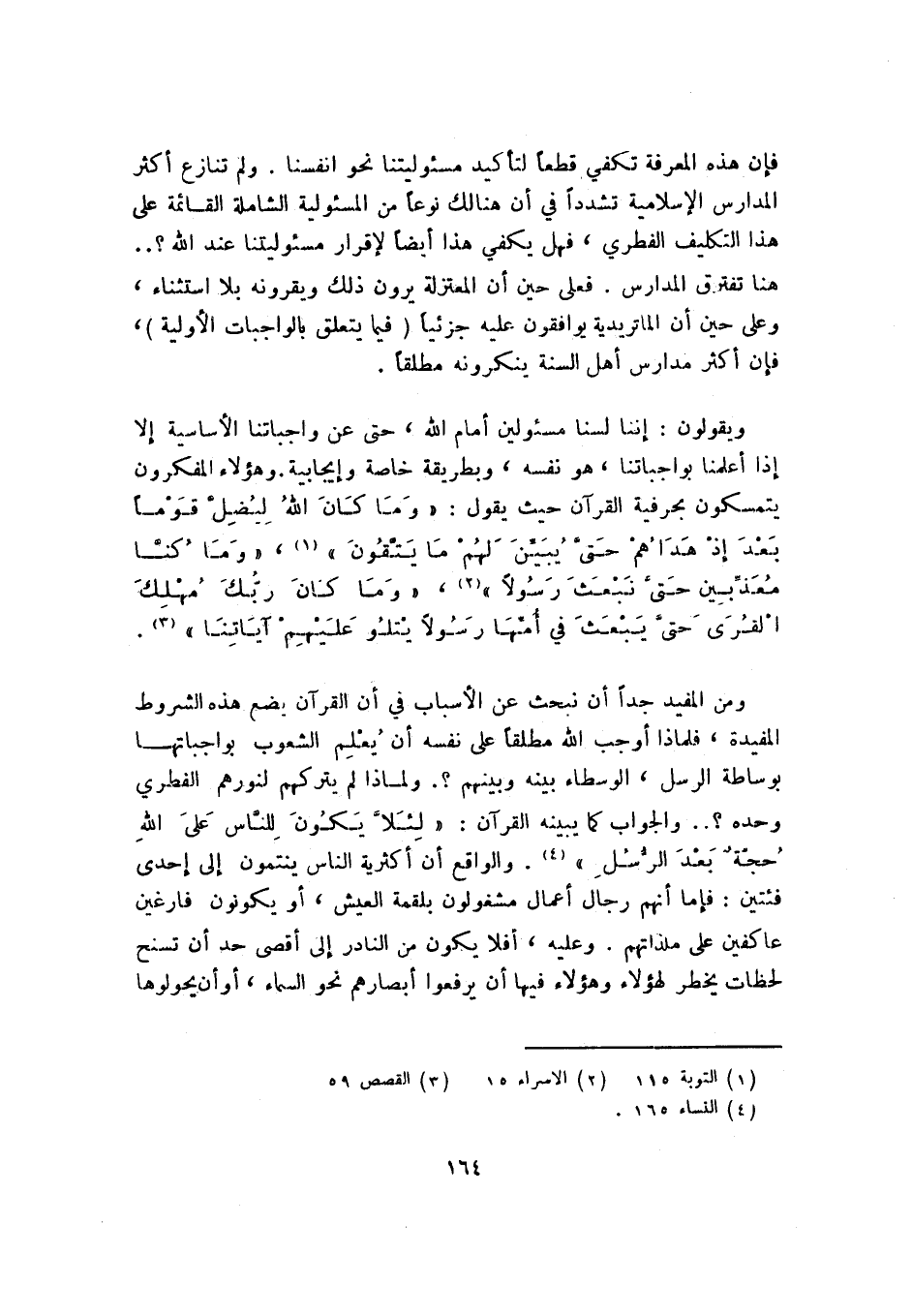 ويقولون: إننا لسنا مسئولين أمام الله، حتى عن واجباتنا الأساسية إلا إذا أعلمنا بواجباتنا، هو نفسه، وبطريقة خاصة وإيجابية. وهؤلاء المفكرون يتمسكون بحرفية القرآن حيث يقول: {وَمَا كَانَ اللَّهُ لِيُضِلَّ قَوْمًا بَعْدَ إِذْ هَدَاهُمْ حَتَّى يُبَيِّنَ لَهُمْ مَا يَتَّقُونَ} 1، {وَمَا كُنَّا مُعَذِّبِينَ حَتَّى نَبْعَثَ رَسُولًا} 2، {وَمَا كَانَ رَبُّكَ مُهْلِكَ الْقُرَى حَتَّى يَبْعَثَ فِي أُمِّهَا رَسُولًا يَتْلُو عَلَيْهِمْ آيَاتِنَا} 3.