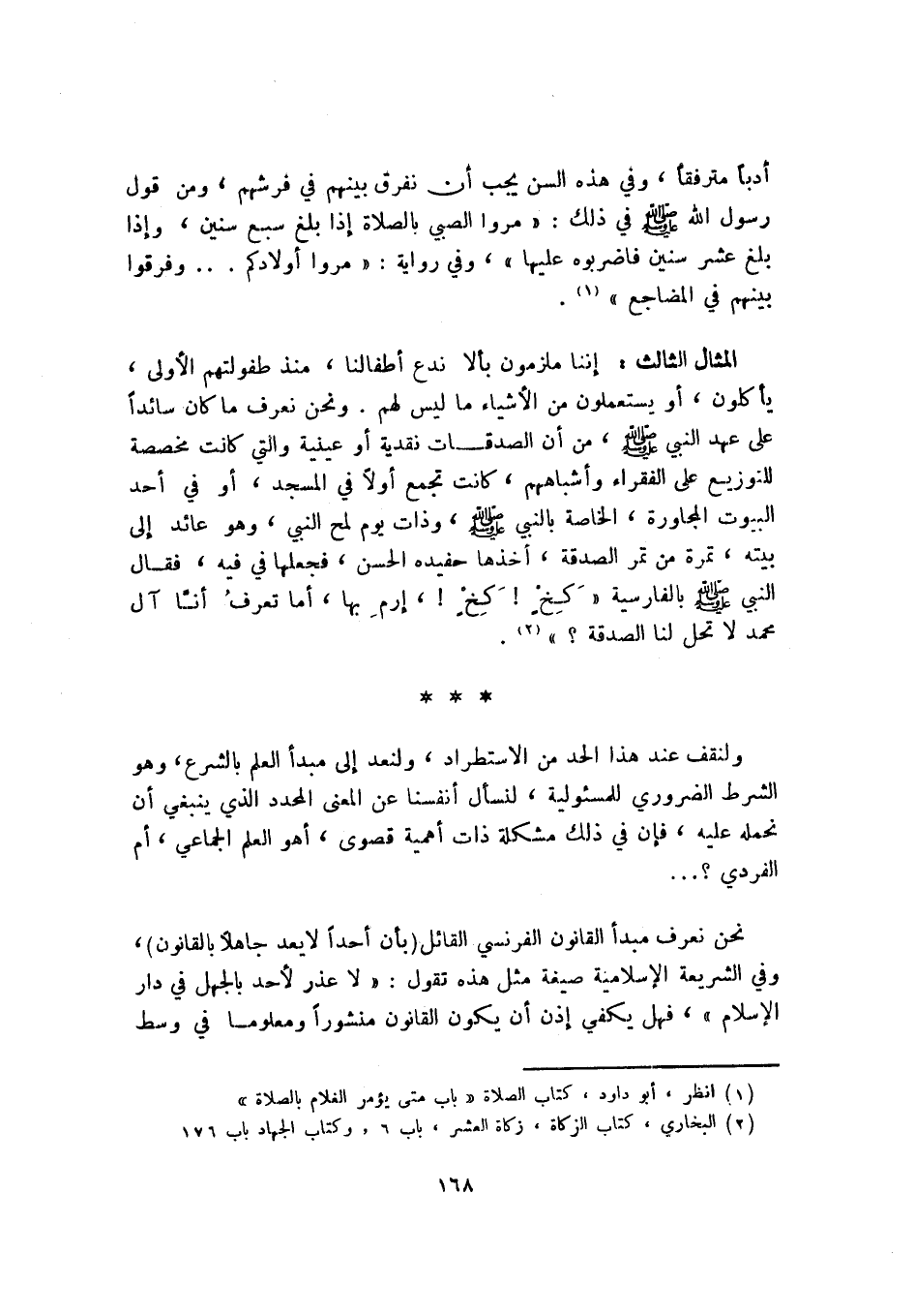 إننا ملزمون بألا ندع أطفالنا منذ طفولتهم الأولى، يأكلون، أو يستعملون من الأشياء ما ليس لهم. ونحن نعرف ما كان سائدًا على عهد النبي -صلى الله عليه وسلم- من أن الصدقات نقدية أو عينية والتي كانت مخصصة للتوزيع على الفقراء وأشباههم، كانت تجمع أولًا في المسجد، أو في أحد البيوت المجاورة، الخاصة بالنبي -صلى الله عليه وسلم- وذات يوم لمح النبي، وهو عائد إلى بيته، تمرة من تمر الصدقة، أخذها حفيده الحسن، فجعلها في فيه، فقال النبي -صلى الله عليه وسلم- بالفارسية "كخ! كخ! ارم بها، أما تعرف أنَّا آل محمد لا تحل لنا الصدقة؟ " 2.