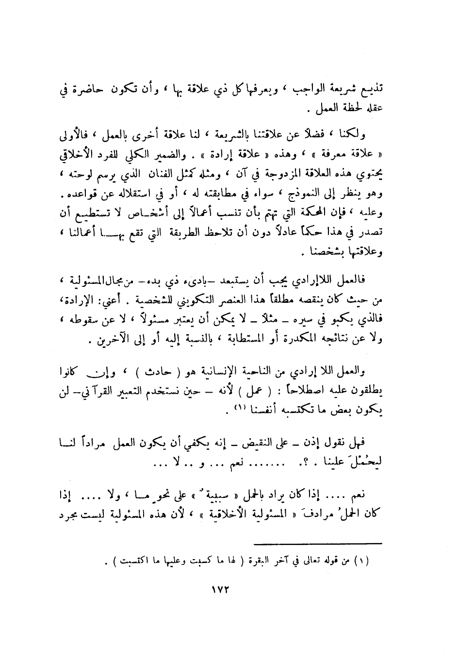 فالعمل اللاإرادي يجب أن يستبعد -بادئ ذي بدء- من مجال المسئولية، من حيث كان ينقصه مطلقًا هذا العنصر التكويني للشخصية. أعني: الإرادة، فالذي يكبو في سيره -مثلًا- لا يمكن أن يعتبر مسئولًا، لا عن سقوطه، ولا عن نتائجه المكدرة أو المستطابة، بالنسبة إليه أو إلى الآخرين.