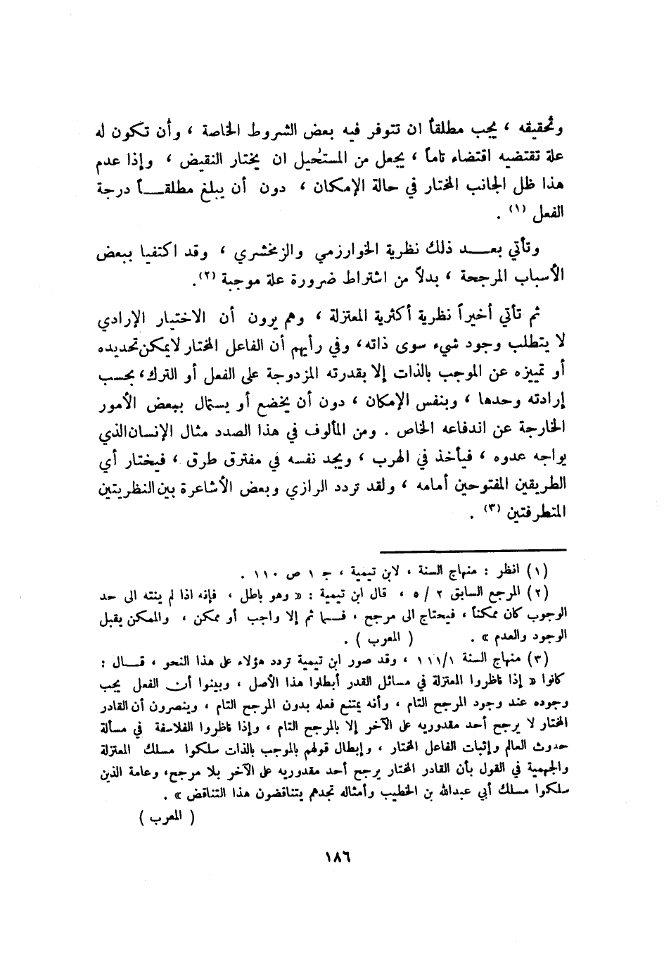 3 منهاج السنة 1/ 111، وقد صور ابن تيمية تردد هؤلاء على هذا النحو، قال: كانوا "إذا ناظروا المعتزلة في مسائل القدر أبطلوا هذا الأصل، وبينوا أن الفعل يجب وجوده عند وجود المرجح التام، وأنه يمتنع فعله بدون المرجح التام، وينصرون أن القادر المختار لا يرجح أحد مقدوريه على الآخر إلا بالمرجح التام، وإذا ناظروا الفلاسفة في مسألة حدوث العالم وإثبات الفاعل المختار. وإبطال قولهم بالموجب بالذات سلكوا مسلك المعتزلة والجهمية في القول بأن القادر المختار يرجح أحد مقدوريه على الآخر بلا مرجح، وعامة الذين سلكوا مسلك أبي عبد الله بن الخطيب وأمثاله تجدهم يتناقضون هذا التناقض". "المعرب".