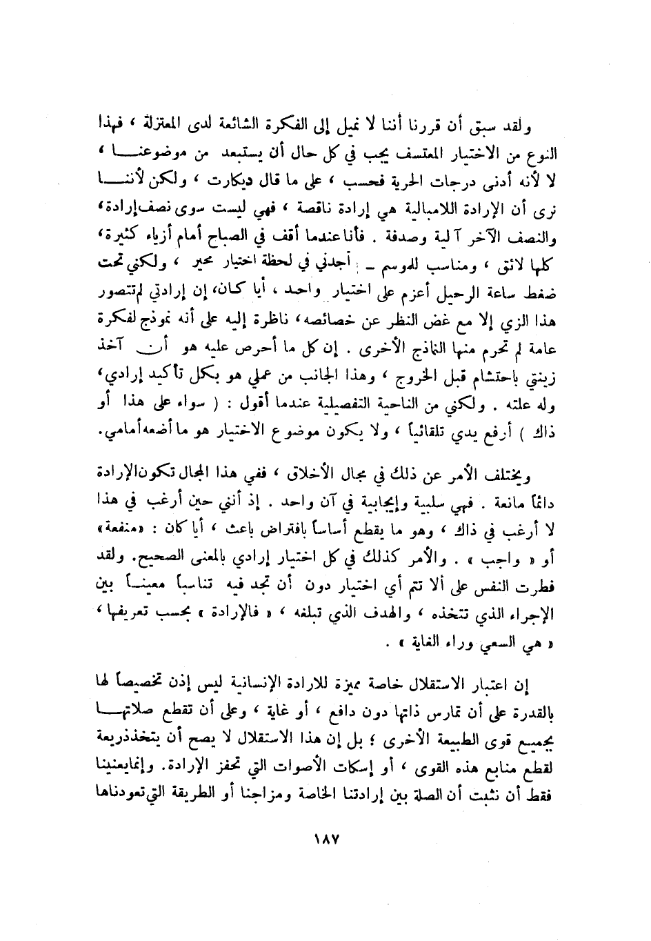 إن اعتبار الاستقلال خاصة مميزة للإرادة الإنسانية ليس إذن تخصيصًا لها بالقدرة على أن تمارس ذاتها دون دافع، أو غاية، وعلى أن تقطع صلاتها بجميع قوى الطبيعة الأخرى؛ بل إن هذا الاستقلال لا يصح أن يتخذ ذريعة لقطع منابع هذه القوى، أو إسكات الأصوات التي تحفز الإرادة، وإنما يعنينا فقط أن نثبت أن الصلة بين إرادتنا الخاصة ومزاجنا أو الطريقة التي تعودناها