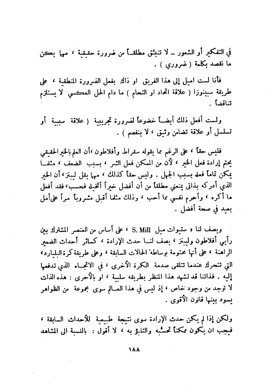 ويصف لنا ستيوات ميل s. mill، على أساس من العنصر المشترك بين رأيي أفلاطون وليبنز، يصف لنا حدث الإرادة، كسائر أحداث الضمير الراهنة، على أنها محتومة بوساطة الحالات السابقة، وعلى طريقة كرة البليارد، التي تتحرك عندما تتلقى صدمة الكرة الأخرى، في الاتجاه الذي تدفعها إليه. فذاتنا قد تشهد هذا المنظر بطريقة سلبية، أو بالأحرى: هذه الذات لا توجد من وجود خاص، إذ ليس في هذا العالم سوى مجموعة من الظواهر يسود بينها قانون الأقوى.