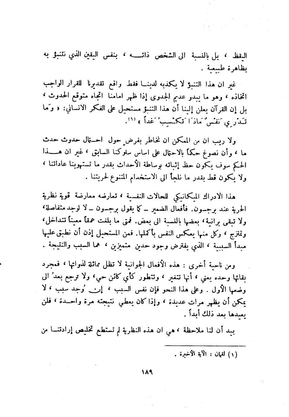 غير أن هذا التنبؤ لا يكذبه لدينا فقط واقع تقديرنا للقرار الواجب اتخاذه، وهو ما يبدو عديم الجدوى إذا ظهر أمامنا اتجاه متوقع الحدوث، بل إن القرآن يعلن إلينا أن هذا التنبؤ مستحيل على الفكر الإنساني: {وَمَا تَدْرِي نَفْسٌ مَاذَا تَكْسِبُ غَدًا} 1.