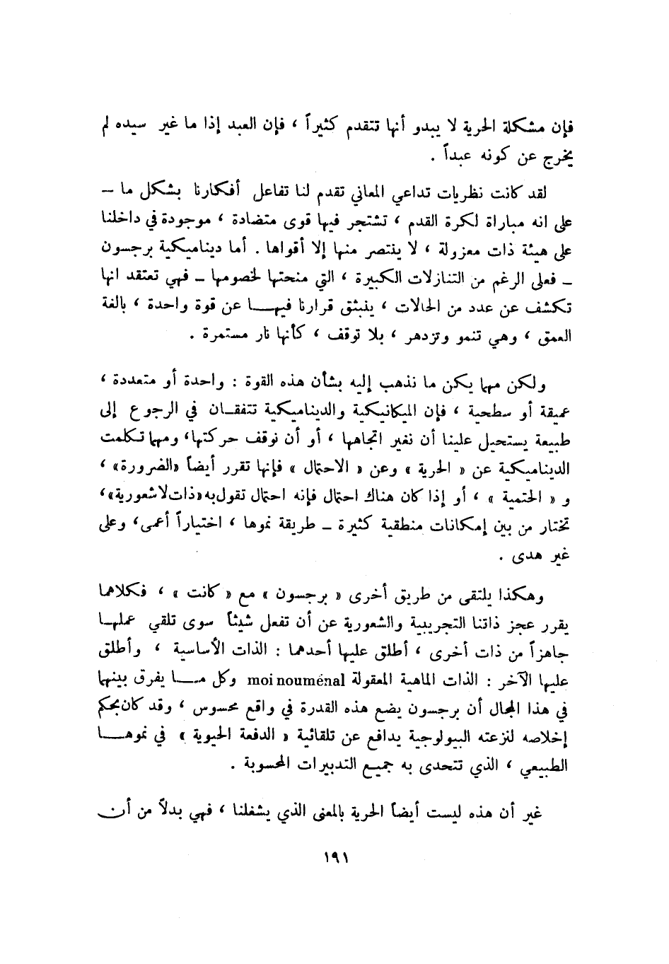وهكذا يلتقي من طريق أخرى "برجسون" مع "كانت"، فكلاهما يقرر عجز ذاتنا التجريبية والشعورية عن أن تفعل شيئًا سوى تلقي عملها جاهزًا من ذات أخرى، أطلق عليها أحدهما: الذات الأساسية، وأطق عليها الآخر: الذات الماهية المعقولة moi noumenal وكل ما يفرق بينهما في هذا المجال أن برجسون يضع هذه القدرة في واقع محسوس، وقد كان بحكم إخلاصه لنزعته البيولوجية يدافع عن تلقائية "الدفعة الحيوية" في نموها الطبيعي، الذي تتحدى به جميع التدبيرات المحسوبة.