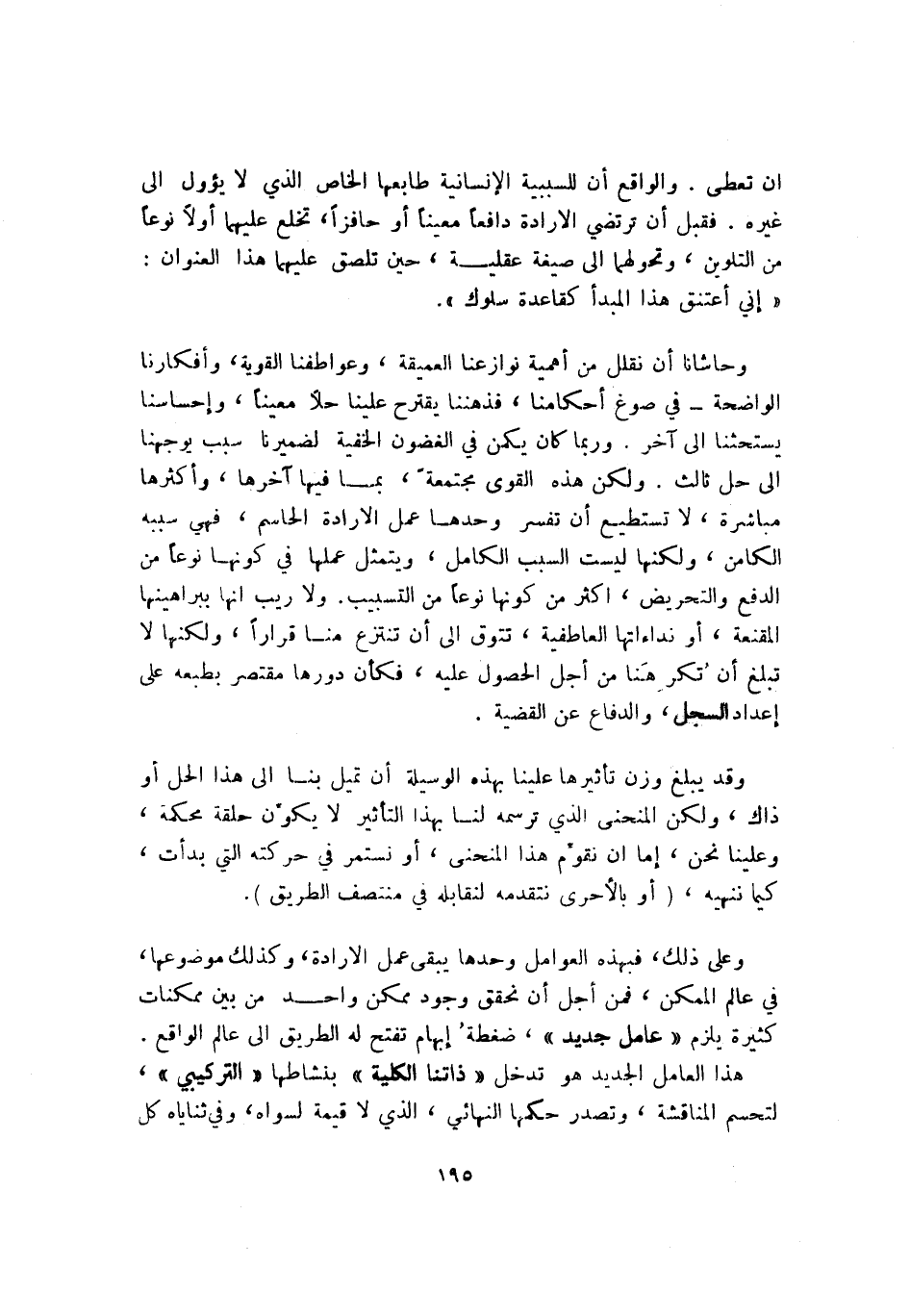 أن تعطى. والواقع أن للسببية الإنسانية طابعها الخاص الذي لا يئول إلى غيره. فقبل أن ترتضي الإرادة دافعًا معينًا أو حافزًا، تخلع عليهما أولًا نوعًا من التلوين، وتحولهما إلى صيغة عقلية، حين تلصق عليهما هذا العنوان: "إني أعتنق هذا المبدأ كقاعدة سلوك".