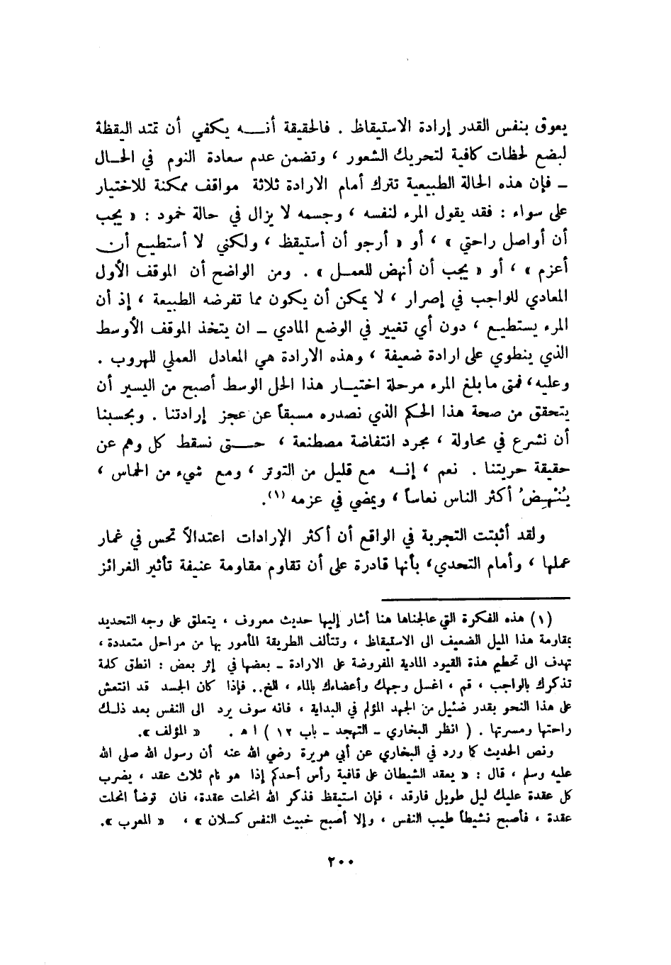 1 هذه الفكرة التي عالجناها هنا أشار إليها حديث معروف، يتعلق على وجه التحديد بمقاومة هذا الميل الضعيف إلى الاستيقاظ. وتتألف الطريقة المأمور بها من مراحل متعددة، تهدف إلى تحطيم هذه القيود المادية المفروضة على الإرادة -بعضها في إثر بعض: انطق كلمة تذكرك بالواجب، قم، اغسل وجهك وأعضاءك بالماء ... إلخ. فإذا كان الجسد قد انتعش على هذا النحو بقدر ضئيل من الجهد المؤلم في البداية، فإنه سوف يرد إلى النفس بعد ذلك راحتها ومسرتها. "انظر البخاري, التهجد, باب 12" اهـ. "المؤلف".