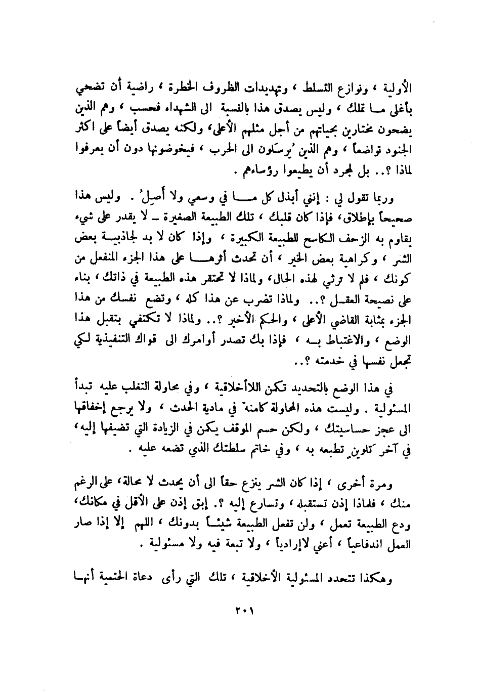 الأولية، ونوازع التسلط، وتهديدات الظروف الخطرة، راضية أن تصحي بأغلى ما تملك، وليس يصدق هذا بالنسبة إلى الشهداء فحسب، وهم الذين يضحون مختارين بحياتهم من أجل مثلهم الأعلى، ولكنه يصدق أيضًا على أكثر الجنود تواضعًا، وهم الذين يرسلون إلى الحرب، فيخوضونها دون أن يعرفوا لماذا؟ بل لمجرد أن يطيعوا رؤساءهم.