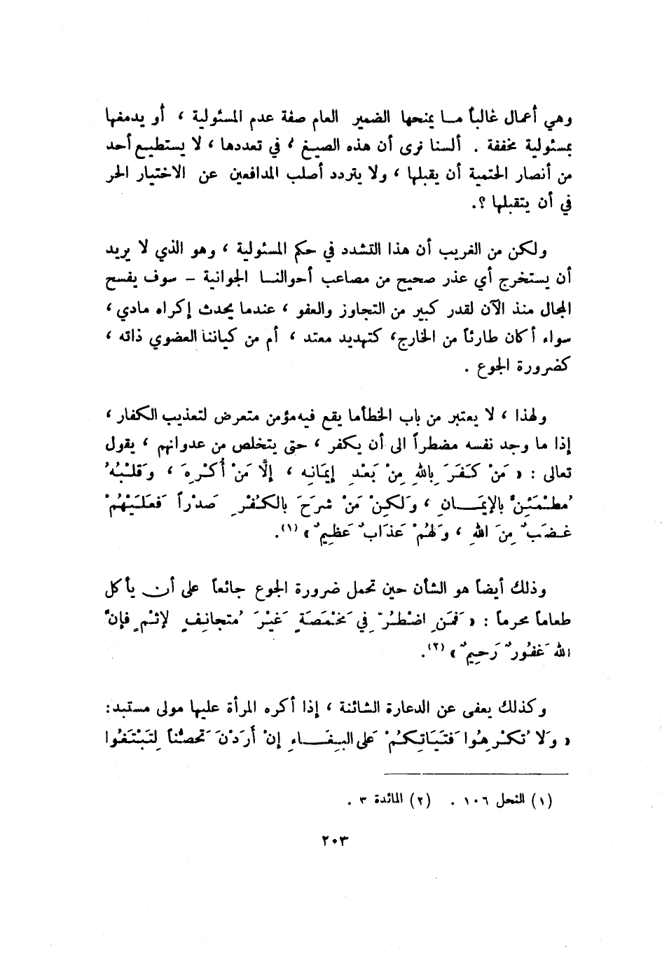 ولكن من الغريب أن هذا التشدد في حكم المسئولية، وهو الذي لا يريد أن يستخرج أي عذر صحيح من مصاعب أحوالنا الجوانية -سوف يفسح المجال منذ الآن لقدر كبير من التجاوز والعفو، عندما يحدث إكراه مادي، سواء أكان طارئًا من الخارج، كتهديد معتد، أم من كياننا العضوي ذاته، كضرورة الجوع.