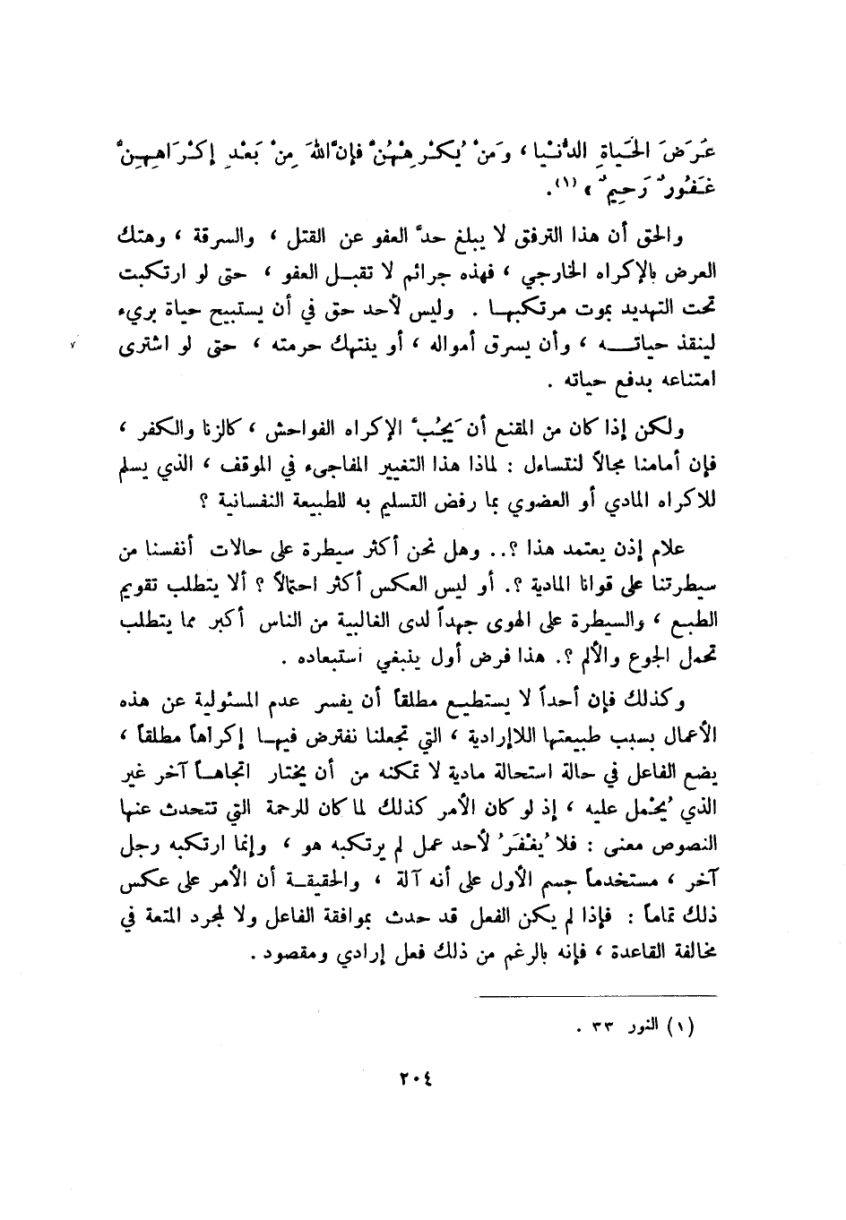ولكن إذا كان من المقنع أن يجب الإكراه الفواحش، كالزنا والكفر، فإن أمامنا مجالًا لنتساءل: لماذا هذا التغيير المفاجئ في الموقف، الذي يسلم للإكراه المادي أو العضوي بما رفض التسليم به للطبيعة النفسانية؟