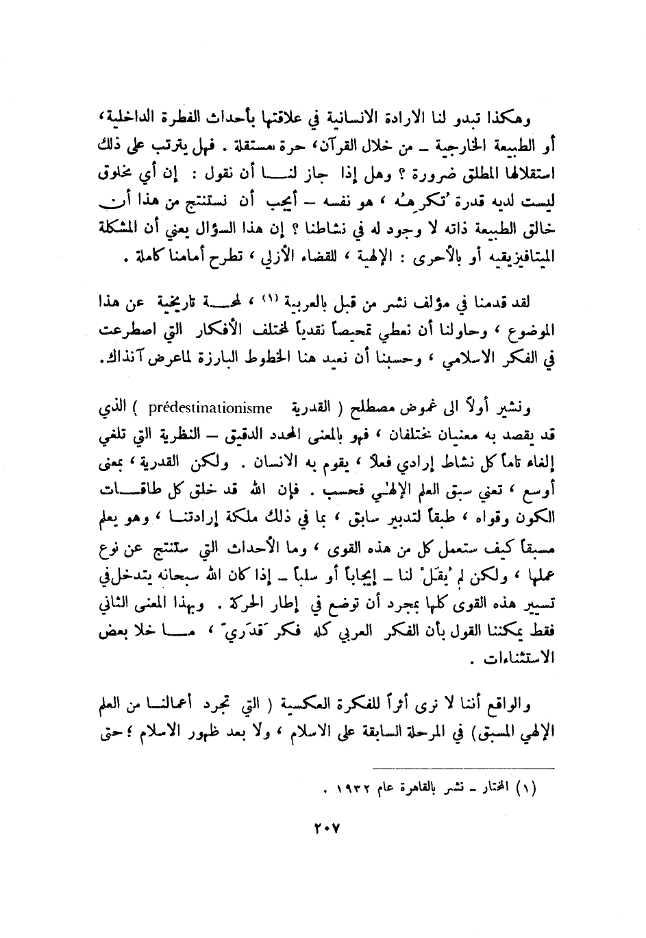 ونشير أولًا إلى غموض مصطلح "القدرية predestinationisme" الذي قد يقصد به معنيان مختلفان، فهو بالمعنى المحدد الدقيق -النظرية التي تلغي إلغاء تامًّا كل نشاط إرادي فعلًا، يقوم به الإنسان. ولكن القدرية، بمعنى أوسع، تعني سبق العلم الإلهي فحسب. فإن الله قد خلق كل طاقات الكون وقواه، طبقًا لتدبير سابق، بما في ذلك ملكة إرادتنا, وهو يعلم مسبقًا كيف ستعمل كل من هذه القوى, وما الأحداث التي ستنتج عن نوع عملها، ولكن لم يقل لنا -إيجابًا أو سلبًا- إذا كان الله سبحانه يتدخل في تسيير هذه القوى كلها بمجرد أن توضع في إطار الحركة، وبهذا المعنى الثاني فقط يمكننا القول بأن الفكر العربي كله فكر قدري، ما خلا بعض الاستثناءات.