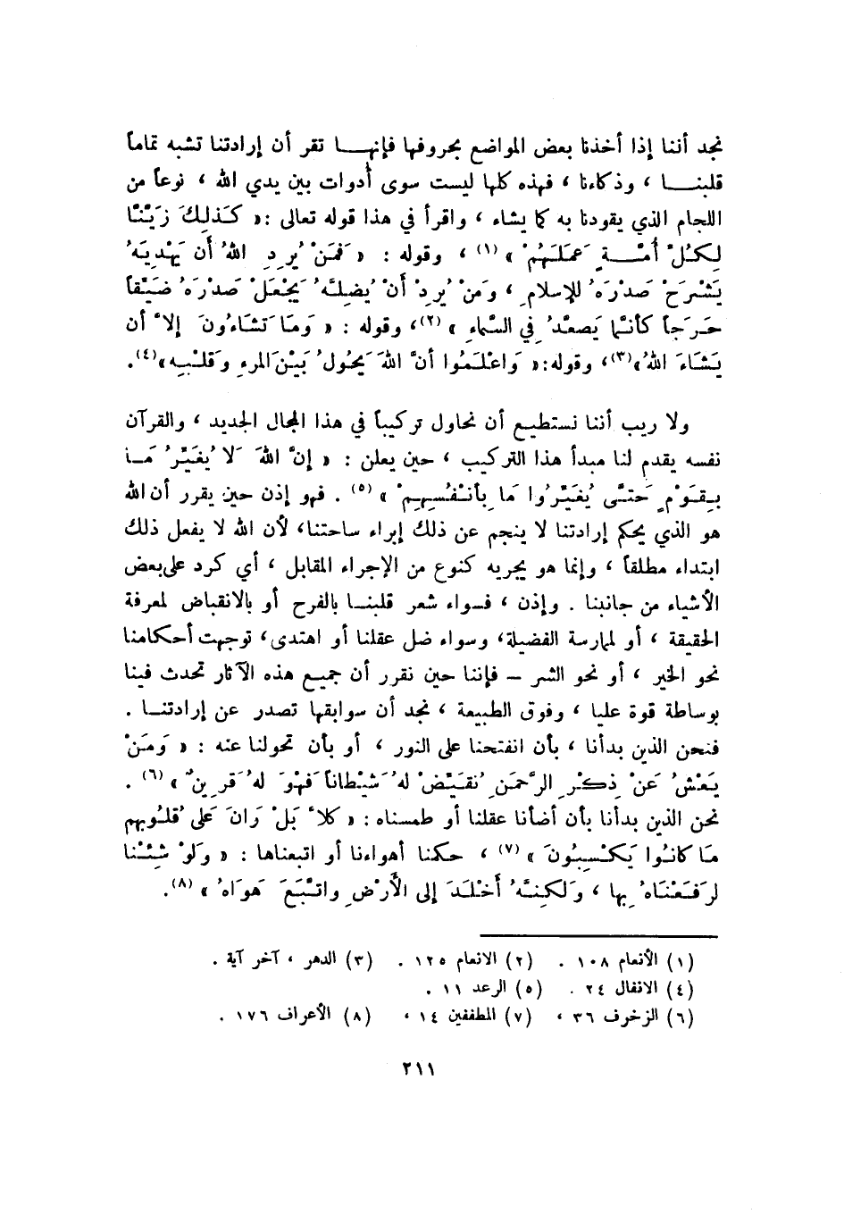 نجد أننا إذا أخذنا بعض المواضع بحروفها فإنها تقر أن إرادتنا تشبه تمامًا قلبنا، وذكاءنا، فهذه كلها ليست سوى أدوات بين يدي الله، نوعًا من اللجام الذي يقودنا به كما يشاء، واقرأ في هذا قوله تعالى: {كَذَلِكَ زَيَّنَّا لِكُلِّ أُمَّةٍ عَمَلَهُمْ} 1، وقوله: {فَمَنْ يُرِدِ اللَّهُ أَنْ يَهْدِيَهُ يَشْرَحْ صَدْرَهُ لِلإِسْلامِ وَمَنْ يُرِدْ أَنْ يُضِلَّهُ يَجْعَلْ صَدْرَهُ ضَيِّقًا حَرَجًا كَأَنَّمَا يَصَّعَّدُ فِي السَّمَاءِ} 2، وقوله: {وَمَا تَشَاءُونَ إِلَّا أَنْ يَشَاءَ اللَّهُ} 3، وقوله: {وَاعْلَمُوا أَنَّ اللَّهَ يَحُولُ بَيْنَ الْمَرْءِ وَقَلْبِهِ} 4.