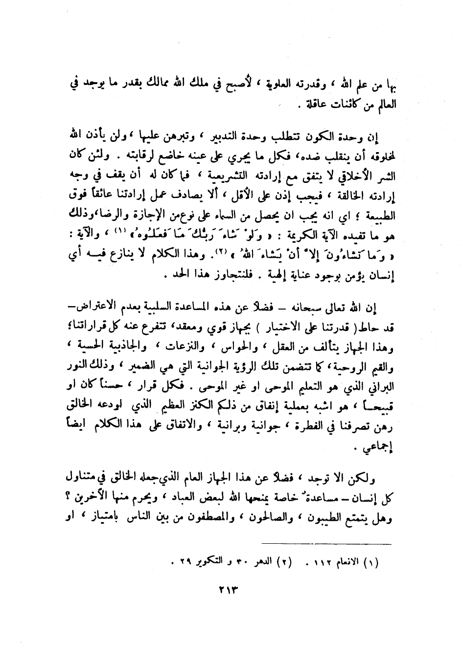إن وحدة الكون تتطلب وحدة التدبير، وتبرهن عليها، ولن يأذن الله لمخلوقه أن ينقلب ضده، فكل ما يجري على عينه خاضع لرقابته. ولئن كان الشر الأخلاقي لا يتفق مع إرادته التشريعية، فما كان له أن يقف في وجه إرادته الخالقة، فيجب إذن على الأقل، ألا يصادف عمل إرادتنا عائقًا فوق الطبيعة؛ أي: إنه يجب أن يحصل من السماء على نوع من الإجازة والرضا، وذلك هو ما تفيده الآية الكريمة: {وَلَوْ شَاءَ رَبُّكَ مَا فَعَلُوهُ} 1، والآية: {وَمَا تَشَاءُونَ إِلَّا أَنْ يَشَاءَ اللَّهُ} 2. وهذا الكلام لا ينازع فيه أي إنسان يؤمن بوجود عناية إلهية. فلنتجاوز هذا الحد.