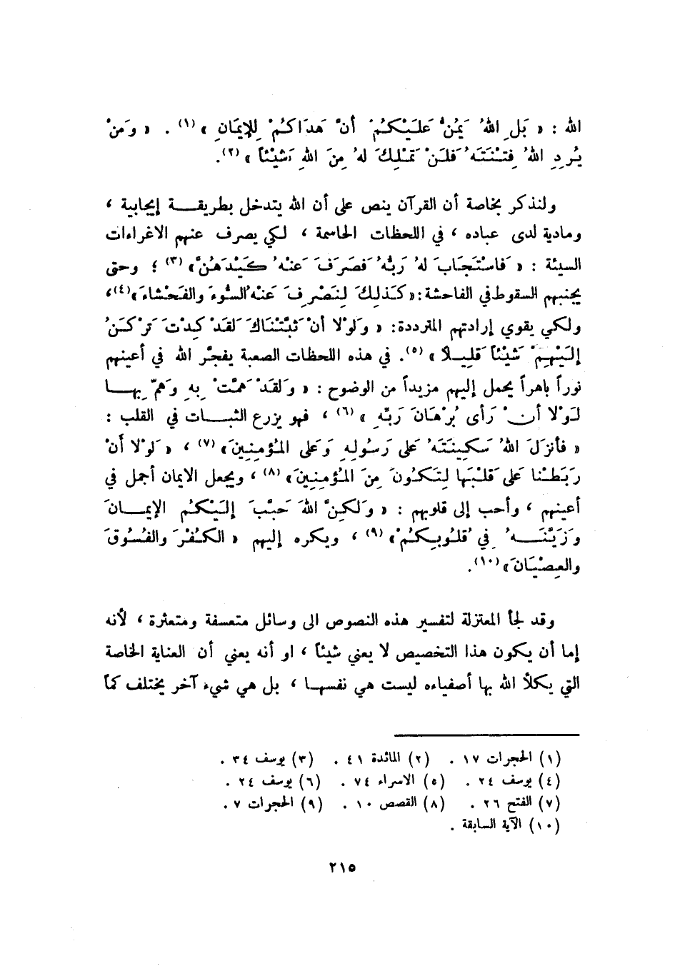 وقد لجأ المعتزلة لتفسير هذه النصوص إلى وسائل متعسفة ومتعثرة؛ لأنه إما أن يكون هذا التخصيص لا يعني شيئًا، أو أنه يعني أن العناية الخاصة التي يكلأ الله بها أصفياءه ليست هي نفسها، بل هي شيء آخر يختلف كمًّا