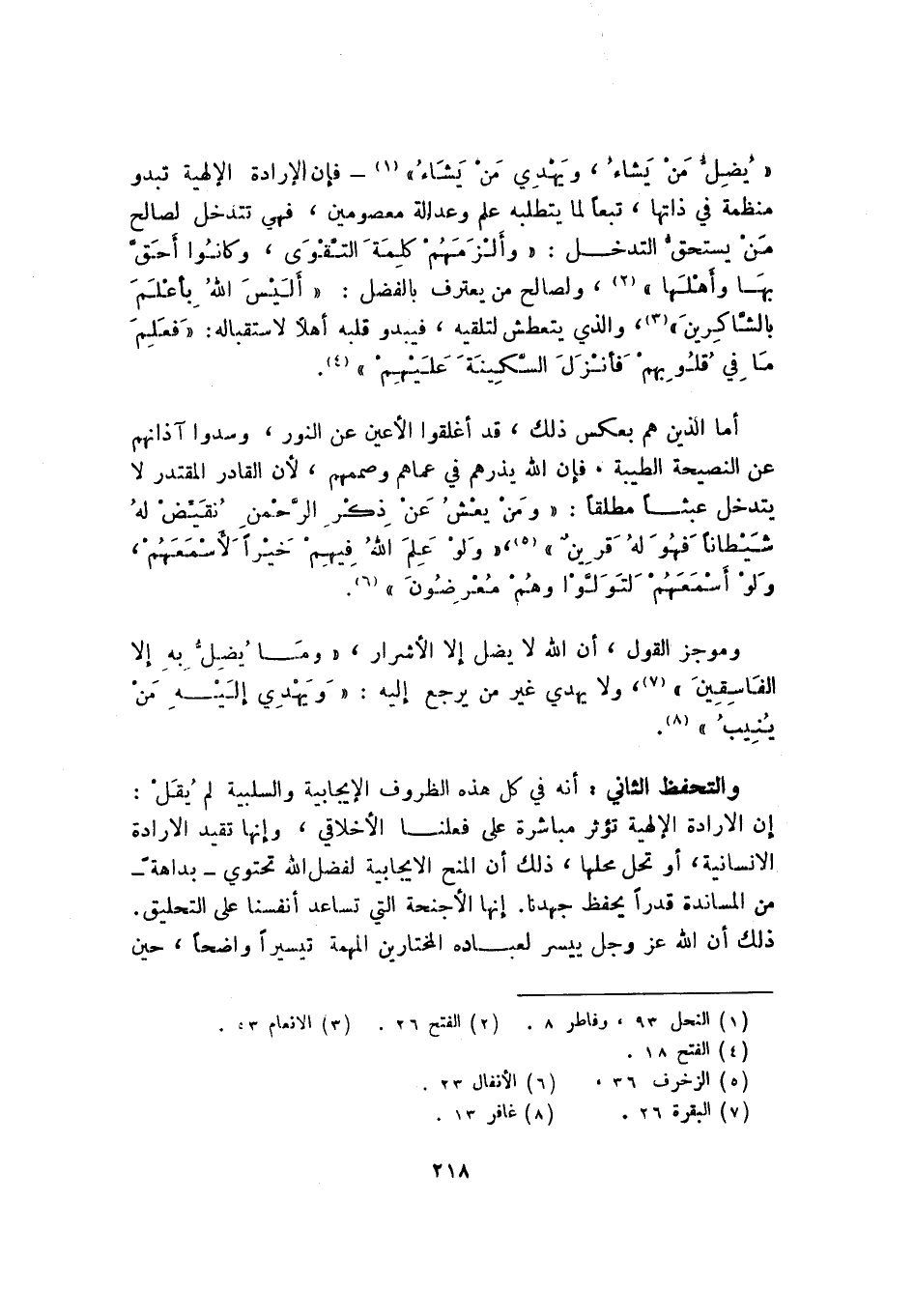 {يُضِلُّ مَنْ يَشَاءُ وَيَهْدِي مَنْ يَشَاءُ} 1 -فإن الإرادة الإلهية تبدو منظمة في ذاتها، تبعًا لما يتطلبه علم وعدالة معصومين، فهي تتدخل لصالح من يستحق التدخل: {وَأَلْزَمَهُمْ كَلِمَةَ التَّقْوَى وَكَانُوا أَحَقَّ بِهَا وَأَهْلَهَا} 2، ولصالح من يعترف بالفضل: {أَلَيْسَ اللَّهُ بِأَعْلَمَ بِالشَّاكِرِين} 3، والذي يتعطش لتلقيه، فيبدو قلبه أهلًا لاستقباله: {فَعَلِمَ مَا فِي قُلُوبِهِمْ فَأَنْزَلَ السَّكِينَةَ عَلَيْهِمْ} 4.