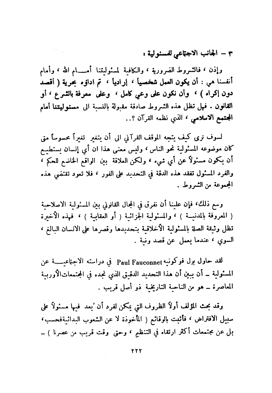 وإذن، فالشروط الضرورية، والكافية لمسئوليتنا أمام الله، وأمام أنفسنا هي: أن يكون العمل شخصيًّا، إراديًّا، تم أداؤه بحرية "أقصد دون إكراه"، وأن نكون على وعي كامل، وعلى معرفة بالشرع، أو القانون، فهل تظل هذه الشروط صادقة مقبولة بالنسبة إلى مسئوليتنا أمام المجتمع الإسلامي، الذي نظمه القرآن؟