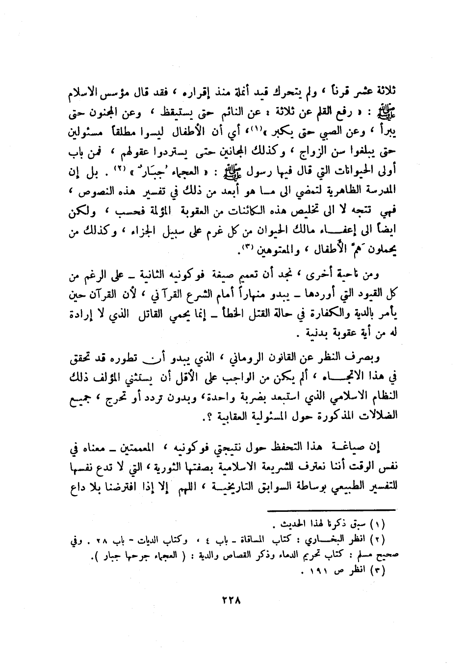 وبصرف النظر عن القانون الروماني، الذي يبدو أن تطوره قد تحقق في هذا الاتجاه، ألم يكن من الواجب على الأقل أن يستثني المؤلف ذلك النظام الإسلامي الذي استبعد بضربة واحدة، وبدون تردد أو تحرج، جميع الضلالات المذكورة حول المسئولية العقابية؟