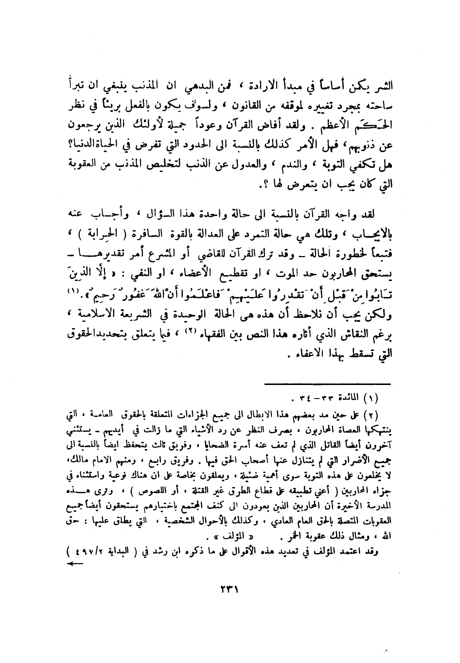 الشر يكمن أساسًا في مبدأ الإرادة، فمن البدهي أن المذنب ينبغي أن تبرأ ساحته بمجرد تغييره لموقفه من القانون، ولسوف يكون بالفعل بريئًا في نظر الحكم الأعظم. ولقد أفاض القرآن وعودًا جميلة لأولئك الذين يرجعون عن ذنوبهم، فهل الأمر كذلك بالنسبة إلى الحدود التي تفرض في الحياة الدنيا؟ هل تكفي التوبة، والندم، والعدول عن الذنب لتخليص المذنب من العقوبة التي كان يجب أن يتعرض لها؟