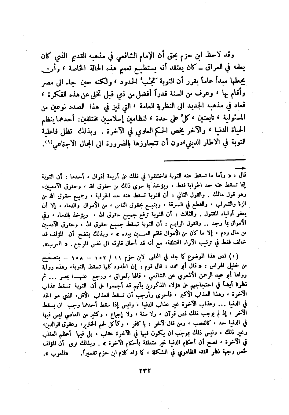 وقد لاحظ ابن حزم بحق أن الإمام الشافعي في مذهبه القديم الذي كان يعلمه في العراق -كان يعتقد أنه يستطيع تعميم هذه الحالة الخاصة، وأن يجعلها مبدأ عامًّا يقرر أن التوبة تجب الحدود، ولكنه حين جاء إلى مصر وأقام بها، وعرف من السنة قدرًا أفضل من ذي قبل تخلى عن هذه الفكرة، فعاد في مذهبه الجديد إلى النظرية العامة، التي تميز في هذا الصدد نوعين من المسئولية، تابعتين، كل على حدة، لنظامين إسلاميين مختلفين: أحدهما ينظم الحياة الدنيا، والآخر يخص الحكم العلوي في الآخرة. وبذلك تظل فاعلية التوبة في الإطار الديني، دون أن تتجاوزها بالضرورة إلى المجال الاجتماعي1.