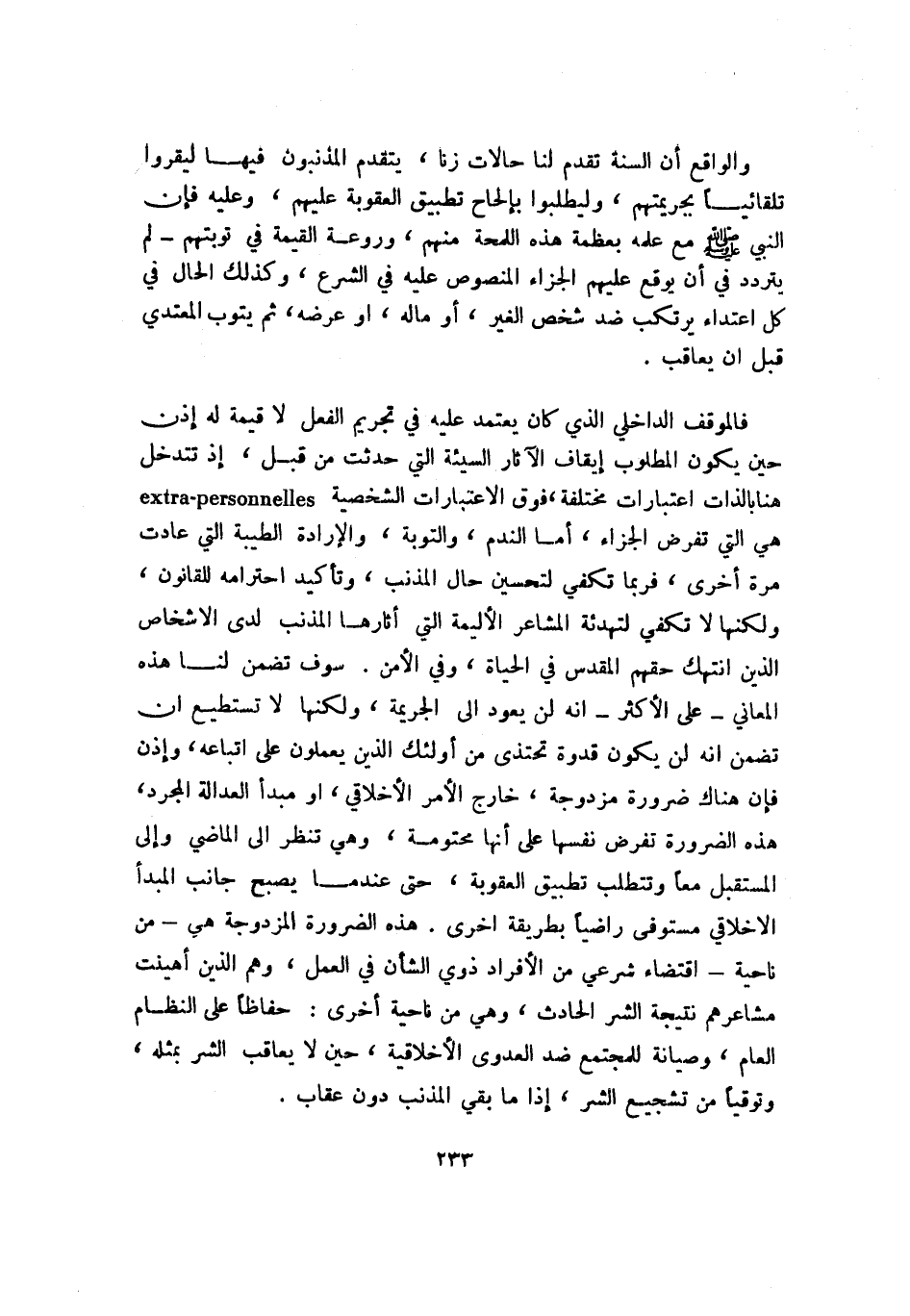 فالموقف الداخلي الذي كان يعتمد عليه في تجريم الفعل لا قيمة له إذن حين يكون المطلوب إيقاف الآثار السيئة التي حدثت من قبل، إذ تتدخل هنا بالذات اعتبارات مختلفة، فوق الاعتبارات الشخصية extra - personnelles هي التي تفرض الجزاء، أما الندم، والتوبة، والإرادة الطيبة التي عادت مرة أخرى، فربما تكفي لتحسين حال المذنب، وتأكيد احترامه للقانون، ولكنها لا تكفي لتهدئة المشاعر الأليمة التي أثارها المذنب لدى الأشخاص الذين انتهك حقهم المقدس في الحياة، وفي الأمن. سوف تضمن لنا هذه المعاني -على الأكثر- أنه لن يعود إلى الجريمة، ولكنها لا تستطيع أن تضمن أنه لن يكون قدوة تحتذى من أولئك الذين يعملون على اتباعه، وإذن فإن هناك ضرورة مزدوجة، خارج الأمر الأخلاقي، أو مبدأ العدالة المجرد، هذه الضرورة تفرض نفسها على أنها محتومة، وهي تنظر إلى الماضي وإلى المستقبل معًا وتتطلب تطبيق العقوبة، حتى عندما يصبح جانب المبدأ الأخلاقي مستوفى راضيًا بطريقة أخرى. هذه الضرورة المزدوجة هي -من ناحية- اقتضاء شرعي من الأفراد ذوي الشأن في العمل، وهم الذين أهينت مشاعرهم نتيجة الشر الحادث، وهي من ناحية أخرى: حفاظًا على النظام العام، وصيانة للمجتمع ضد العدوى الأخلاقية، حين لا يعاقب الشر بمثله، وتوقيًا من تشجيع الشر، إذا ما بقي المذنب دون عقاب.