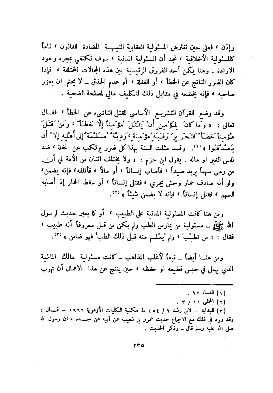 وقد وضع القرآن التشريع الأساسي للقتل الناشئ عن الخطأ، فقال تعالى: {وَمَا كَانَ لِمُؤْمِنٍ أَنْ يَقْتُلَ مُؤْمِنًا إِلَّا خَطًَا وَمَنْ قَتَلَ مُؤْمِنًا خَطًَا فَتَحْرِيرُ رَقَبَةٍ مُؤْمِنَةٍ وَدِيَةٌ مُسَلَّمَةٌ إِلَى أَهْلِهِ إِلَّا أَنْ يَصَّدَّقُوا} 1. وقد مثلت السُّنة بهذا كل ضرر يرتكب عن غفلة، ضد نفس الغير، أو ماله. يقول ابن حزم: "ولا يختلف اثنان من الأمة في أن من رمى سهمًا يريد صيدًا، فأصاب إنسانًا، أو مالًا، فأتلفه، فإنه يضمن، ولو أنه صادف حمار وحشي يجري، فقتل إنسانًا، أو سقط الحمار إذ أصابه السهم، فقتل إنسانًا، فإنه لا يضمن شيئًا"2.