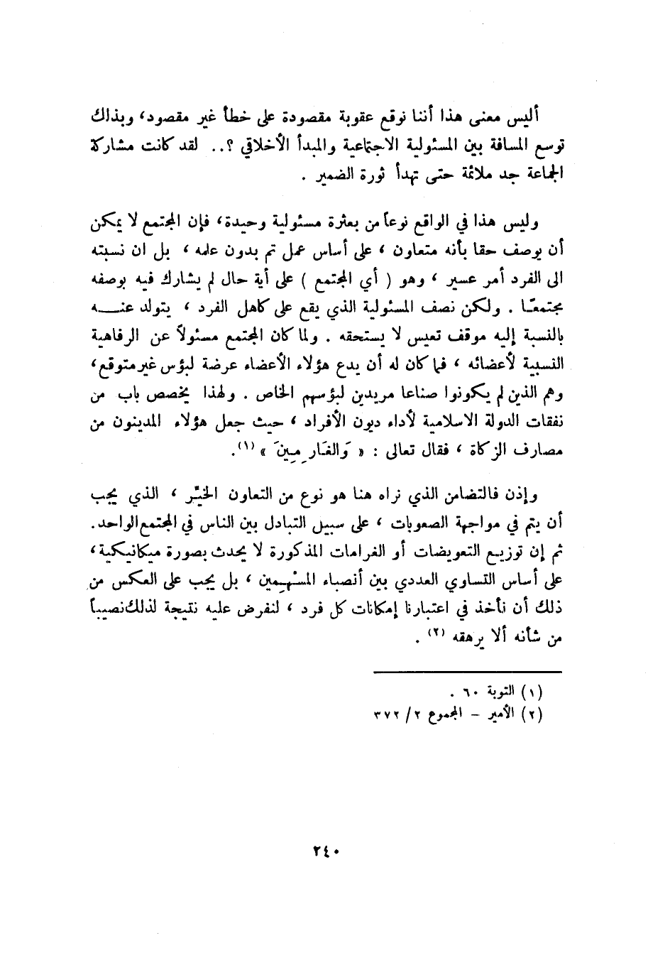 وليس هذا في الواقع نوعًا من بعثرة مسئولية وحيدة، فإن المجتمع لا يمكن أن يوصف حقًّا بأنه متعاون، على أساس عمل تم بدون علمه، بل أن نسبته إلى الفرد أمر عسير، وهو "أي: المجتمع" على أية حال لم يشارك فيه بوصفه مجتمعًا. ولكن نصف المسئولية الذي يقع على كاهل الفرد، يتولد عنه بالنسبة إليه موقف تعيس لا يستحقه. ولما كان المجتمع مسئولًا عن الرفاهية النسبية لأعضائه، فما كان له أن يدع هؤلاء الأعضاء عرضة لبؤس غير متوقع، وهم الذين لم يكونوا صناعًا مريدين لبؤسهم الخاص. ولهذا يخصص باب من نفقات الدولة الإسلامية لأداء ديون الأفراد، حيث جعل هؤلاء المدينون من مصارف الزكاة، فقال تعالى: {وَالْغَارِمِين} 1.