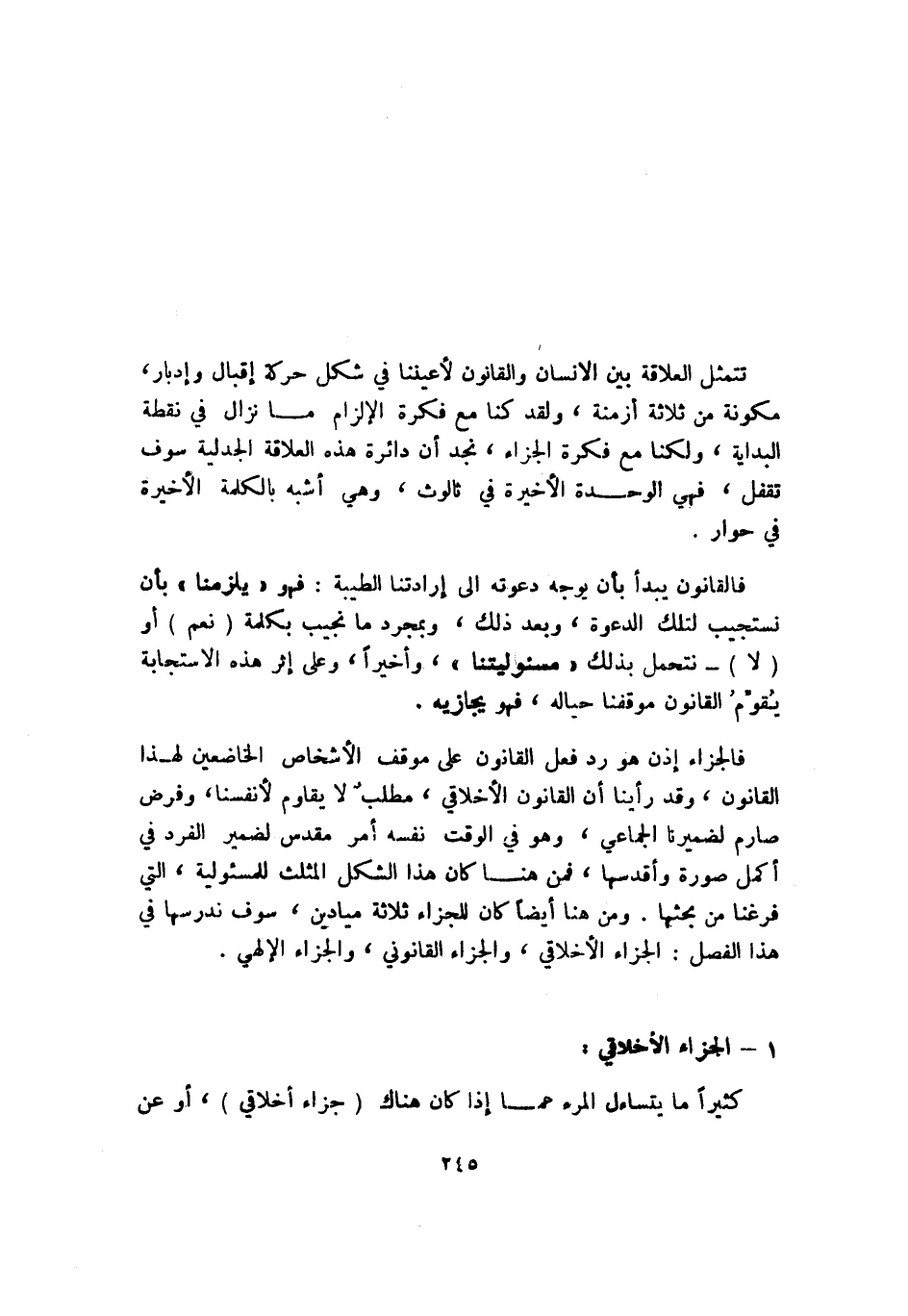 تتمثل العلاقة بين الإنسان والقانون لأعيننا في شكل حركة إقبال وإدبار، مكونة من ثلاثة أزمنة، ولقد كنا مع فكرة الإلزام ما نزال في نقطة البداية، ولكنا مع فكرة الجزاء، نجد أن دائرة هذه العلاقة الجدلية سوف تقفل، فهي الوحدة الأخيرة في ثالوث، وهي أشبه بالكلمة الأخيرة في حوار.