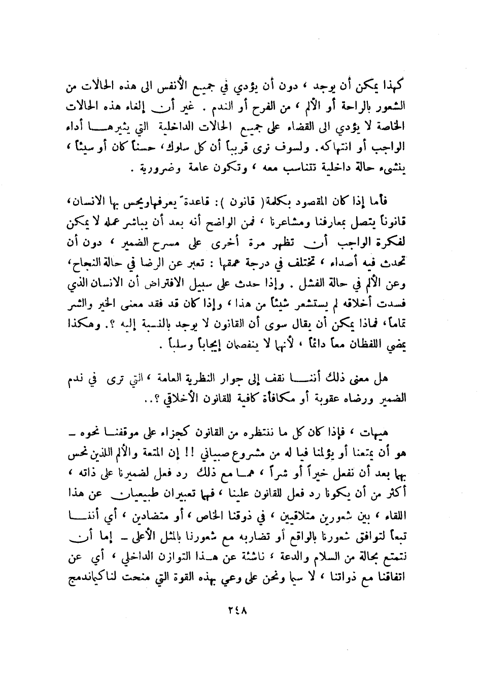 فأما إذا كان المقصود بكلمة "قانون"، قاعدة يعرفها ويحس بها الإنسان، قانونًا يتصل بمعارفنا ومشاعرنا، فمن الواضح أنه بعد أن يباشر عمله لا يمكن لفكرة الواجب أن تظهر مرة أخرى على مسرح الضمير، دون أن تحدث فيه أصداء، تختلف في درجة عمقها، تعبر عن الرضا في حالة النجاح، وعن الألم في حالة الفشل. وإذا حدث على سبيل الافتراض أن الإنسان الذي فسدت أخلاقه لم يستشعر شيئًا من هذا، وإذا كان قد فقد معنى الخير والشر تمامًا، فماذا يمكن أن يقال سوى أن القانون لا يوجد بالنسبة إليه؟ وهكذا يمضي اللفظان معًا دائمًا؛ لأنهما لا ينفصمان إيجابًا وسلبًا.