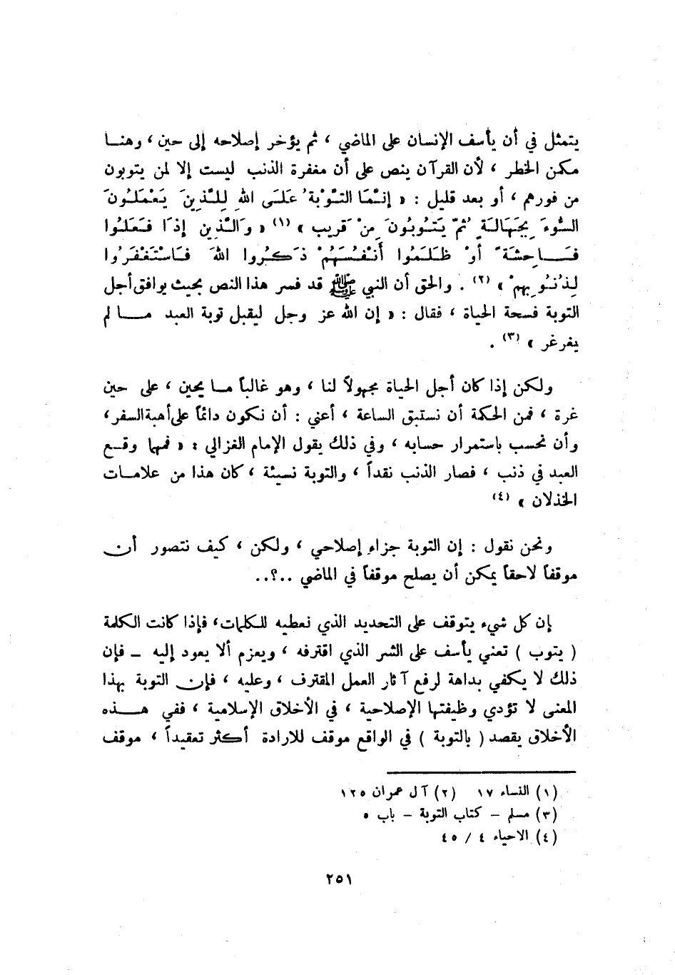 إن كل شيء يتوقف على التحديد الذي نعطيه للكلمات، فإذا كانت الكلمة "يتوب" تعني: يأسف على الشر الذي اقترفه، ويعزم ألا يعود إليه -فإن ذلك لا يكفي بداهة لرفع آثار العمل المقترف، وعليه، فإن التوبة بهذا المعنى لا تؤدي وظيفتها الإصلاحية، في الأخلاق الإسلامية، ففي هذه الأخلاق يقصد "بالتوبة" في الواقع موقف للإرادة أكثر تعقيدًا، موقف.