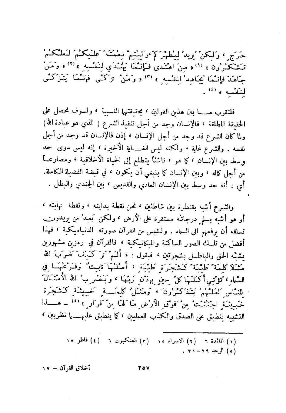 والشرع أشبه بقنطرة بين شاطئين، نحن نقطة بدايته، ونقطة نهايته، أو هو أشبه بسلم درجاته مستقرة على الأرض، ولكن يعد من يريدون تسلقه أن يرفعهم إلى السماء. ولنقتبس من القرآن صورته الديناميكية، فهذا أفضل من تلك الصور الساكنة والميكانيكية، فالقرآن في رمزين مشهورين يشبه الحق والباطل بشجرتين، فيقول: {أَلَمْ تَرَ كَيْفَ ضَرَبَ اللَّهُ مَثَلًا كَلِمَةً طَيِّبَةً كَشَجَرَةٍ طَيِّبَةٍ أَصْلُهَا ثَابِتٌ وَفَرْعُهَا فِي السَّمَاءِ، تُؤْتِي أُكُلَهَا كُلَّ حِينٍ بِإِذْنِ رَبِّهَا وَيَضْرِبُ اللَّهُ الْأَمْثَالَ لِلنَّاسِ لَعَلَّهُمْ يَتَذَكَّرُونَ، وَمَثَلُ كَلِمَةٍ خَبِيثَةٍ كَشَجَرَةٍ خَبِيثَةٍ اجْتُثَّتْ مِنْ فَوْقِ الْأَرْضِ مَا لَهَا مِنْ قَرَارٍ} 5 -هذا التشبيه ينطبق على الصدق والكذب العمليين، كما ينطبق عليهما نظريين،