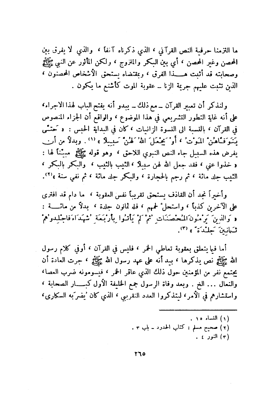 ولنذكر أن تعبير القرآني -مع ذلك- يبدو أنه يفتح الباب لهذا الإجراء، على أنه غاية التطور التشريعي في هذا الموضوع، والواقع أن الجزاء المنصوص في القرآن، بالنسبة إلى النسوة الزانيات، كان في البداية الحبس: {حَتَّى يَتَوَفَّاهُنَّ الْمَوْتُ أَوْ يَجْعَلَ اللَّهُ لَهُنَّ سَبِيلًا} 1. وبدلًا من أن يفرض هذه السبيل جاء النص النبوي اللاحق، وهو قوله -صلى الله عليه وسلم- مبينًا لها: "خذوا عني، فقد جعل الله لهن سبيلًا، الثيب بالثيب، والبكر بالبكر، الثيب جلد مائة، ثم رجم بالحجارة، والبكر جلد مائة، ثم نفي سنة" 2.