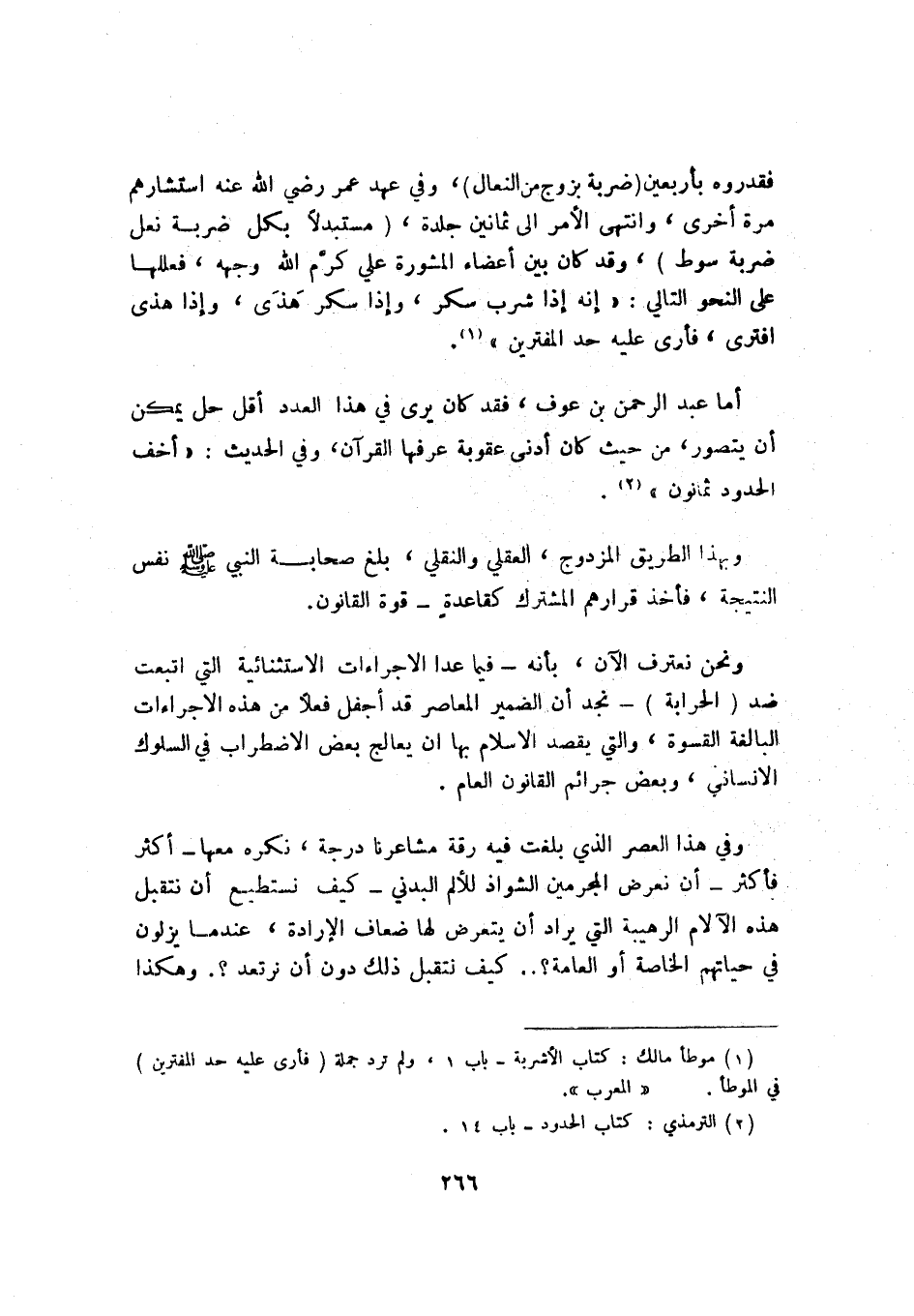 ونحن نعترف الآن، بأنه -فيما عدا الإجراءات الاستثنائية التي اتبعت ضد "الحرابة"- نجد أن الضمير المعاصر قد أجفل فعلًا من هذه الإجراءات البالغة القسوة، والتي يقصد الإسلام بها أن يعالج بعض الاضطراب في السلوك الإنساني، وبعض جرائم القانون العام.