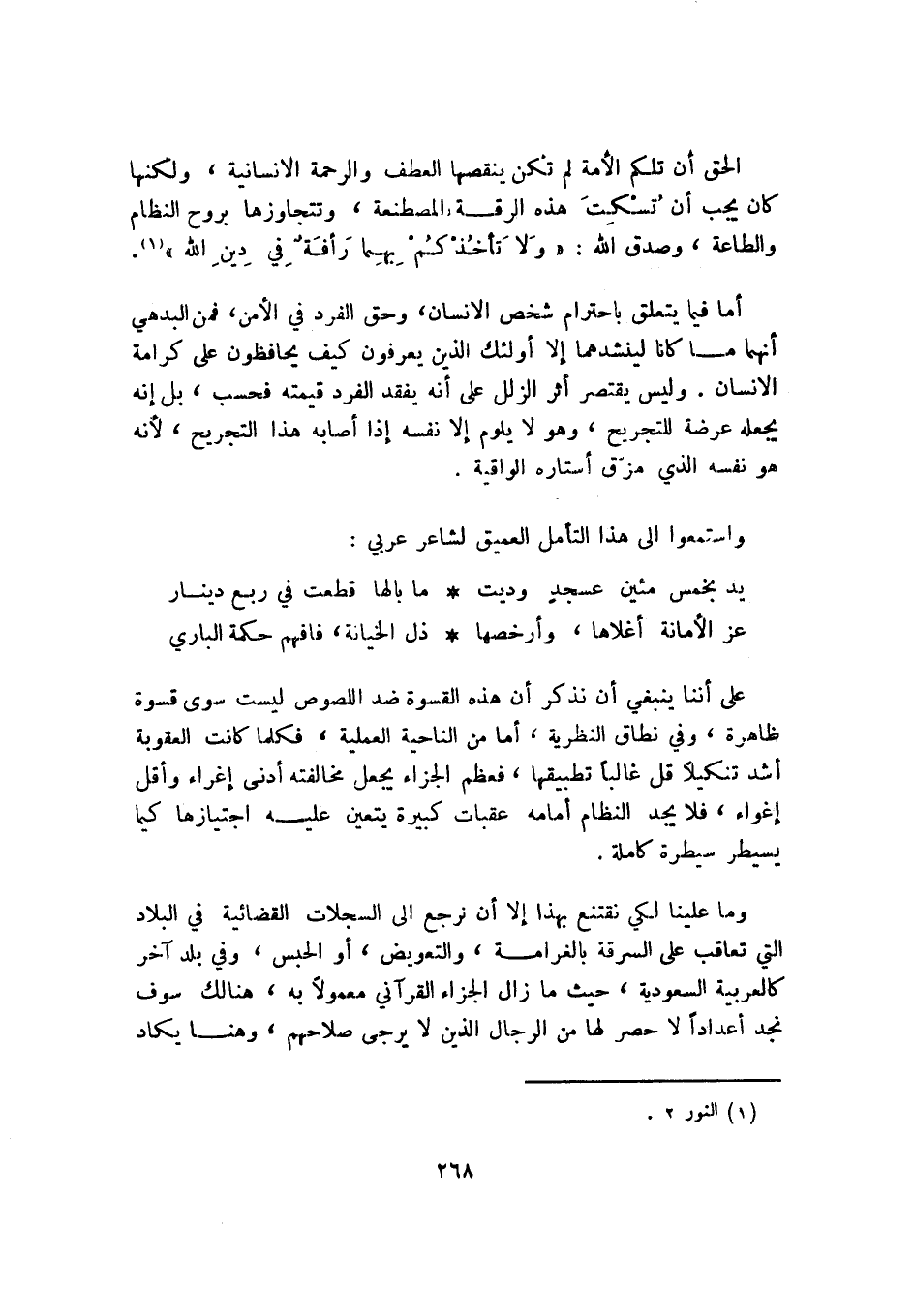 وما علينا لكي نقتنع بهذا إلا أن نرجع إلى السجلات القضائية في البلاد التي تعاقب على السرقة بالغرامة، والتعويض، أو الحبس، وفي بلد آخر كالعربية السعودية، حيث ما زال الجزاء القرآني معمولًا به، هنالك سوف نجد أعدادًا لا حصر لها من الرجال الذين لا يرجى صلاحهم، وهنا يكاد