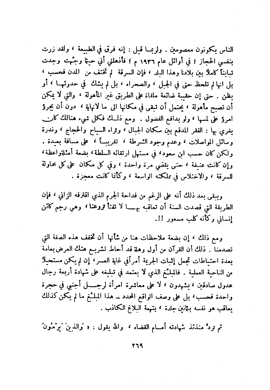 الناس يكونون معصومين. ولربما قيل: إنه فرق في الطبيعة، ولقد زرت بنفسي الحجاز؛ في أوائل عام 1936م فأذهلني أني حيثما وجهت وجدت تباينًا كاملًا بين بلادنا وهذا البلد، فإن السرقة لم تختفي من المدن فحسب، بل إنها لم تلحظ حتى في الجبل، والصحراء، بل لم يشك في حدوثها، أو يظن. حتى إن حقيبة ضائعة ملقاة على الطريق غير المأهولة، والتي لا يمكن أن تصبح مأهولة، يحتمل أن تبقى في مكانها إلى ما لا نهاية، دون أن يجرؤ امرؤ على لمسها، ولو بدافع الفضول. ومع ذلك فكل شيء هنالك كان يغري بها: الفقر المدقع بين سكان الجبال، وثراء السياح والحجاج، وندرة وسائل المواصلات، وعدم وجود الشرطة، تقريبًا، على مسافة بعيدة. ولكن كان حسب ابن سعود، في مستهل ارتقائه السلطة، بضعة أمثلة واعظة، وإن كانت عنيفة، حتى يقضي مرة واحدة، وفي كل مكان على كل محاولة للسرقة، والاختلاس في مملكته الواسعة، وكأنما كانت معجزة.
