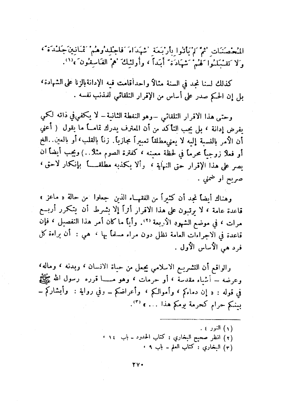 وهناك أيضًا نجد أن كثير من الفقهاء الذين جعلوا من حالة "ماعز" قاعدة عامة، لا يرتبون على هذا الإقرار أثرًا إلا بشرط أن يتكرر أربع مرات، في موضع الشهود الأربعة2. وأيًّا ما كان أمر هذا التفصيل، فإن قاعدة في الإجراءات العامة تظل دون مراء مسلمًا بها، هي: أن براءة كل فرد هي الأساس الأول.
