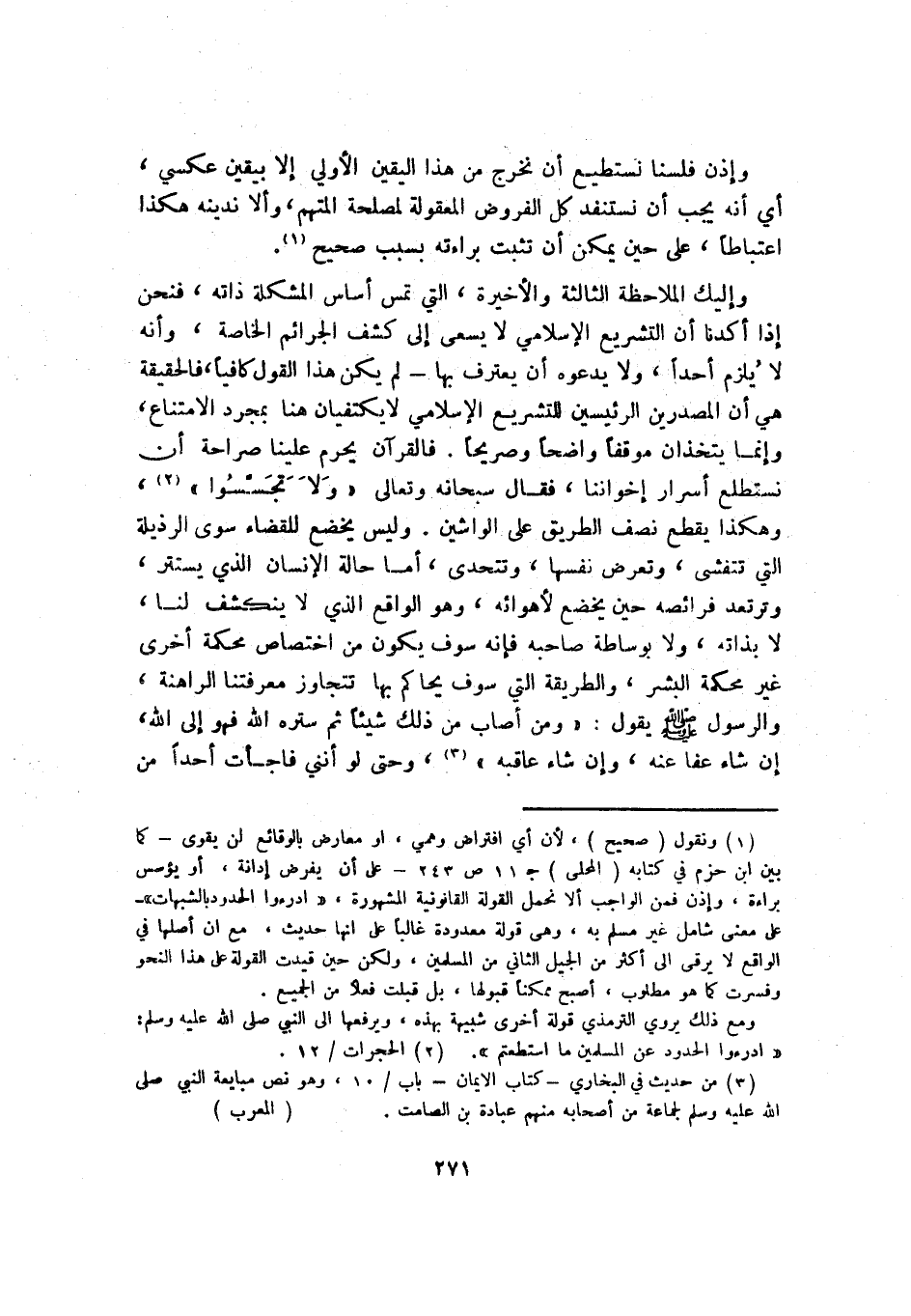 1 ونقول "صحيح"؛ لأن أي افتراض وهمي، أو معارض بالوقائع لن يقوى -كما بين ابن حزم في كتابه "المحلى" جـ11 ص243- على أن يفرض إدانة، أو يؤسس براءة، وإذن فمن الواجب ألا نحمل القولة القانونية المشهورة: "ادرءوا الحدود بالشبهات" -على معنى شامل غير مسلم به، وهي قولة معدودة غالبًا على أنها حديث، مع أن أصلها في الواقع لا يرقى إلى أكثر من الجيل الثاني من المسلمين، ولكن حين قيدت القولة على هذا النحو وفسرت كما هو مطلوب، أصبح ممكنًا قبولها، بل قبلت فعلًا من الجميع.