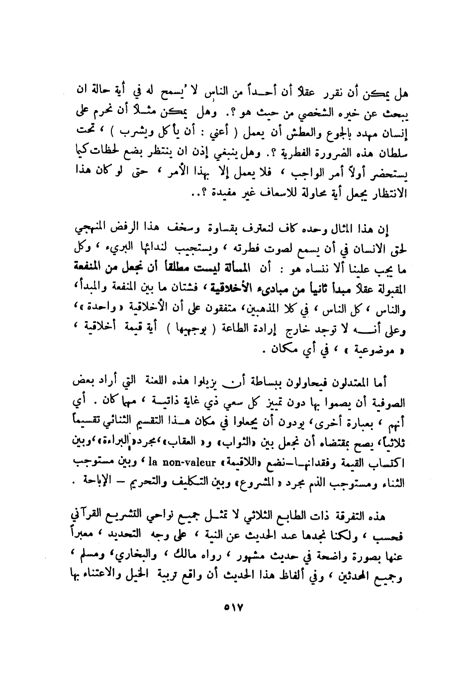 أما المعتدلون فيحاولون ببساطة أن يزيلوا هذه اللعنة التي أراد بعض الصوفية أن يصموا بها دون تمييز كل سعي ذي غاية ذاتية، مهما كان. أي: إنهم، بعبارة أخرى، يودون أن يجعلوا في مكان هذا التقسيم الثنائي تقسيمًا ثلاثيًّا، يصح بمقتضاه أن نجعل بين "الثواب" و"العقاب" مجرد "البراءة"، وبين اكتساب القيمة وفقدانها, نضع "اللاقيمة" la non- valeur، وبين مستوجب الثناء ومستوجب الذم مجرد "المشروع", وبين التكليف والتحريم الإباحة.