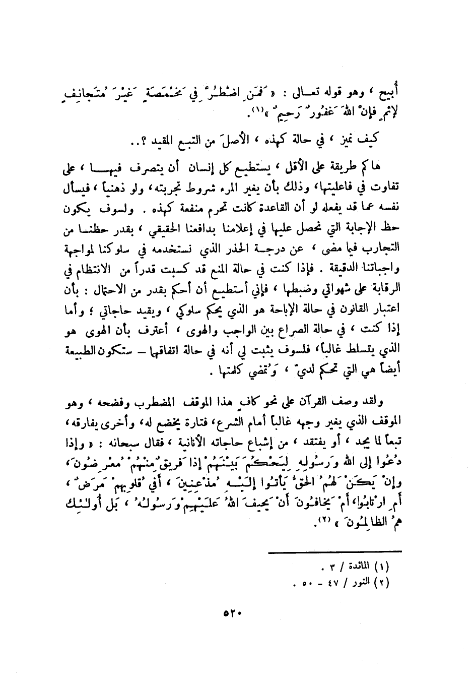 ولقد وصف القرآن على نحو كاف هذا الموقف المضطرب وفضحه، وهو الموقف الذي يغير وجهه غالبًا أمام الشرع، فتارة يخضع له، وأخرى يفارقه، تبعًا لما يجد، أو يفتقد، من إشباع حاجاته الأنانية، فقال سبحانه: {وَإِذَا دُعُوا إِلَى اللَّهِ وَرَسُولِهِ لِيَحْكُمَ بَيْنَهُمْ إِذَا فَرِيقٌ مِنْهُمْ مُعْرِضُونَ، وَإِنْ يَكُنْ لَهُمُ الْحَقُّ يَأْتُوا إِلَيْهِ مُذْعِنِينَ، أَفِي قُلُوبِهِمْ مَرَضٌ أَمِ ارْتَابُوا أَمْ يَخَافُونَ أَنْ يَحِيفَ اللَّهُ عَلَيْهِمْ وَرَسُولُهُ بَلْ أُولَئِكَ هُمُ الظَّالِمُونَ} 2.