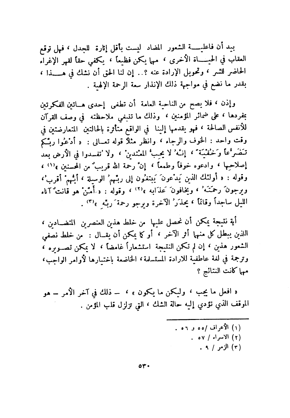 وإذن، فلا يصح من الناحية العامة أن تطغى إحدى هاتين الفكرتين بمفردها، على ضمائر المؤمنين، وذلك ما تنبغي ملاحظته في وصف القرآن للأنفس الصالحة، فهو يقدمها إلينا في الواقع متأثرة بالحالتين المتعارضتين في وقت واحد: الخوف والرجاء، وانظر مثلًا قوله تعالى: {ادْعُوا رَبَّكُمْ تَضَرُّعًا وَخُفْيَةً إِنَّهُ لا يُحِبُّ الْمُعْتَدِينَ، وَلا تُفْسِدُوا فِي الْأَرْضِ بَعْدَ إِصْلاحِهَا وَادْعُوهُ خَوْفًا وَطَمَعًا إِنَّ رَحْمَتَ اللَّهِ قَرِيبٌ مِنَ الْمُحْسِنِينَ} 1، وقوله: {أُولَئِكَ الَّذِينَ يَدْعُونَ يَبْتَغُونَ إِلَى رَبِّهِمُ الْوَسِيلَةَ أَيُّهُمْ أَقْرَبُ وَيَرْجُونَ رَحْمَتَهُ وَيَخَافُونَ عَذَابَهُ} 2، وقوله: {أَمَّنْ هُوَ قَانِتٌ آنَاءَ اللَّيْلِ سَاجِدًا وَقَائِمًا يَحْذَرُ الْآخِرَةَ وَيَرْجُو رَحْمَةَ رَبِّهِ} 3.