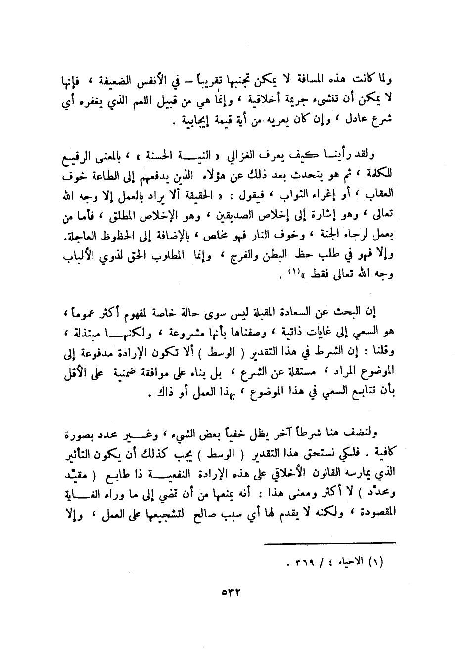 إن البحث عن السعادة المقبلة ليس سوى حالة خاصة لمفهوم أكثر عمومًا، هو السعي إلى غايات ذاتية، وصفناها بأنها مشروعة، ولكنها مبتذلة، وقلنا: إن الشرط في هذا التقدير "الوسط" ألا تكون الإرادة مدفوعة إلى الموضوع المراد، مستقلة عن الشرع، بل بناء على موافقة ضمنية على الأقل بأن تتابع السعي في هذا الموضوع، بهذا العمل أو ذاك.