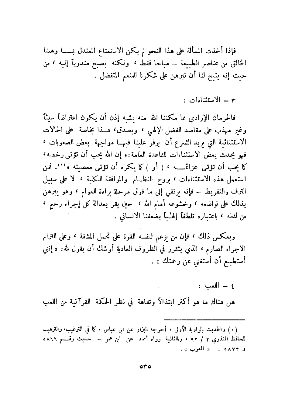 فإذا أخذت المسألة على هذا النحو لم يكن الاستمتاع المعتدل بما وهبنا الخالق من عناصر الطبيعة -مباحًا فقط، ولكنه يصبح مندوبًا إليه، من حيث إنه يتيح لنا أن نبرهن على شكرنا للمنعم المتفضل.