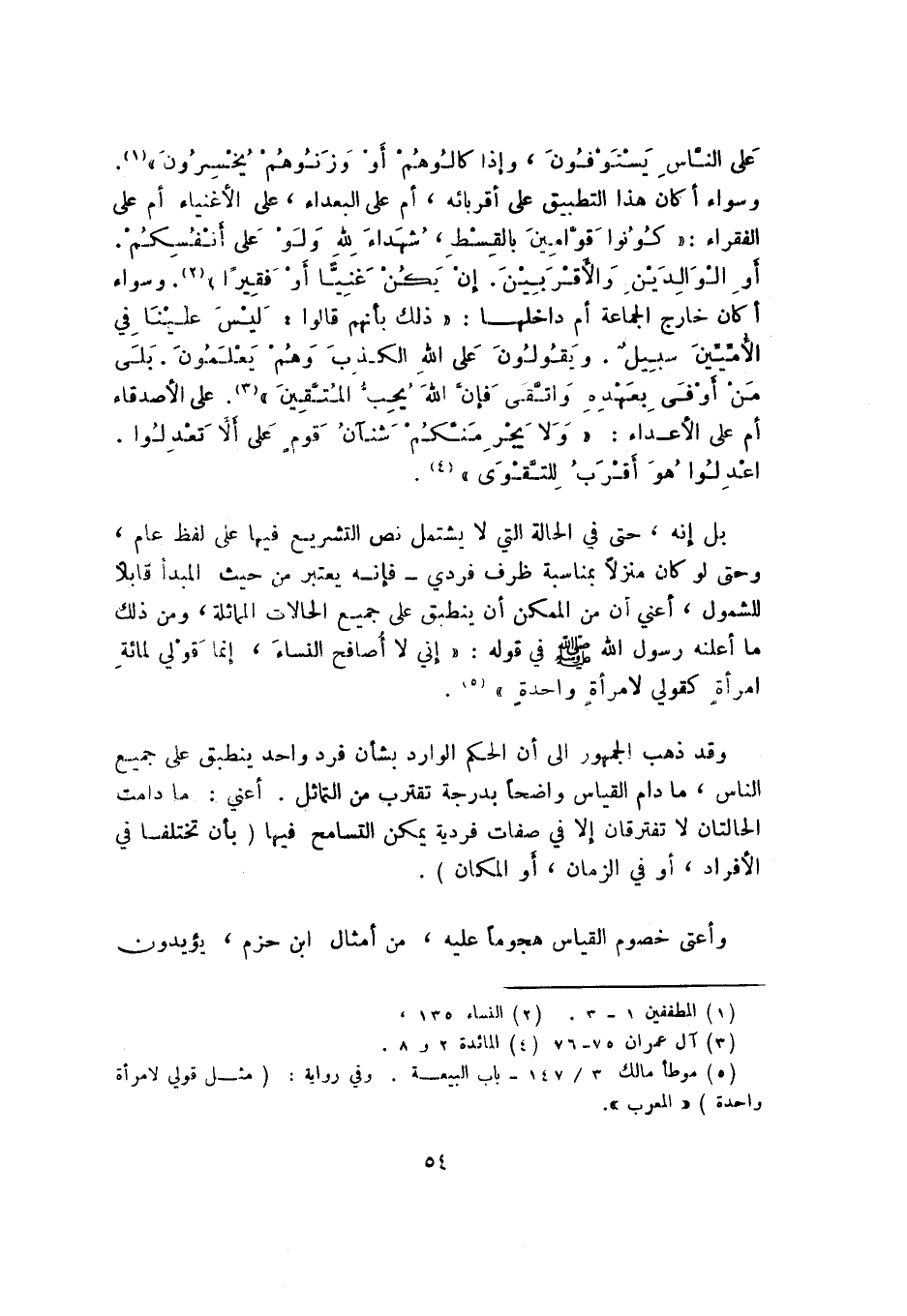 وقد ذهب الجمهور إلى أن الحكم الوارد بشأن فرد واحد ينطبق على جميع الناس، ما دام القياس واضحًا بدرجة تقترب من التماثل. أعني: ما دامت الحالتان لا تفترقان إلا في صفات فردية يمكن التسامح فيها "بأن تختلفا في الأفراد، أو الزمان، أو المكان".